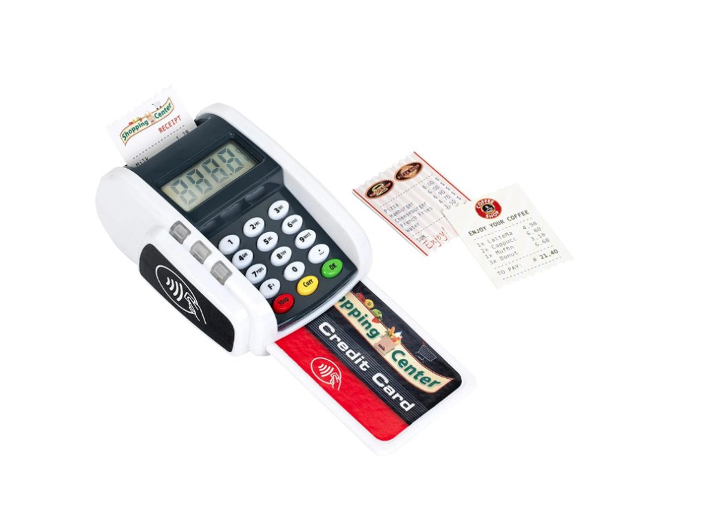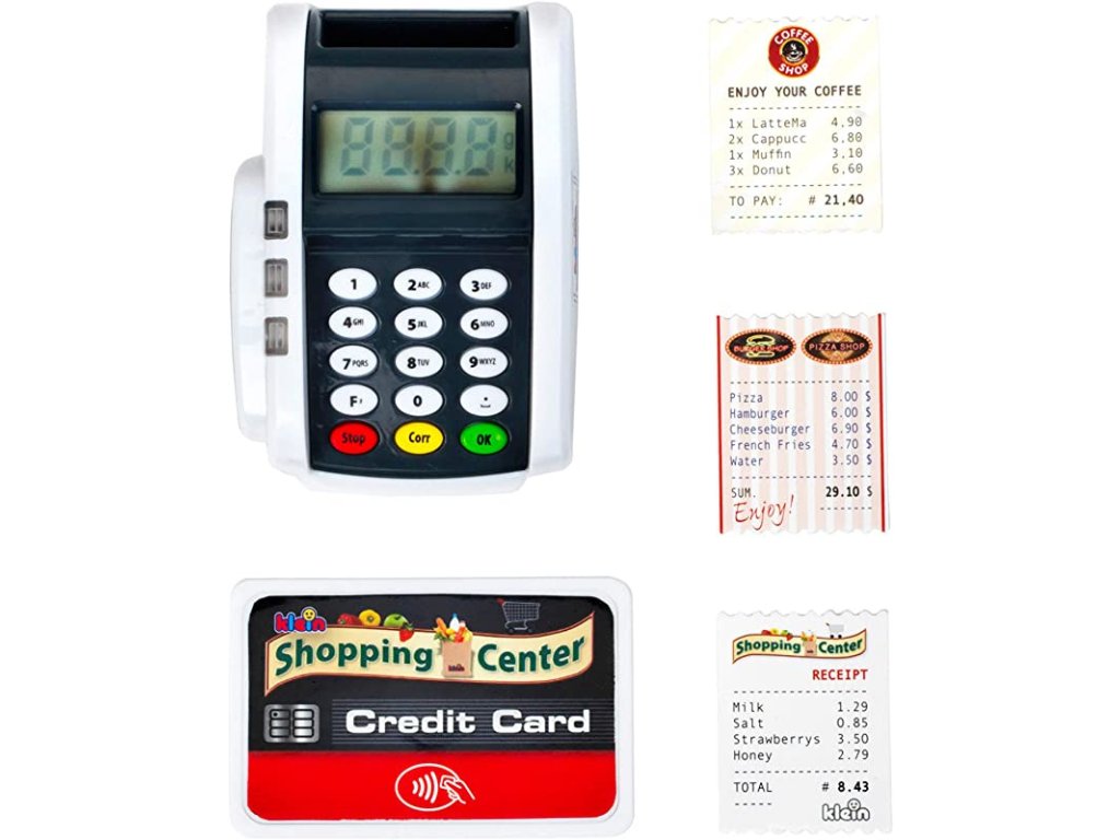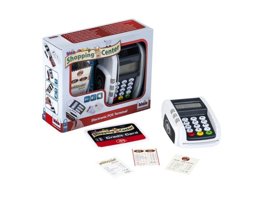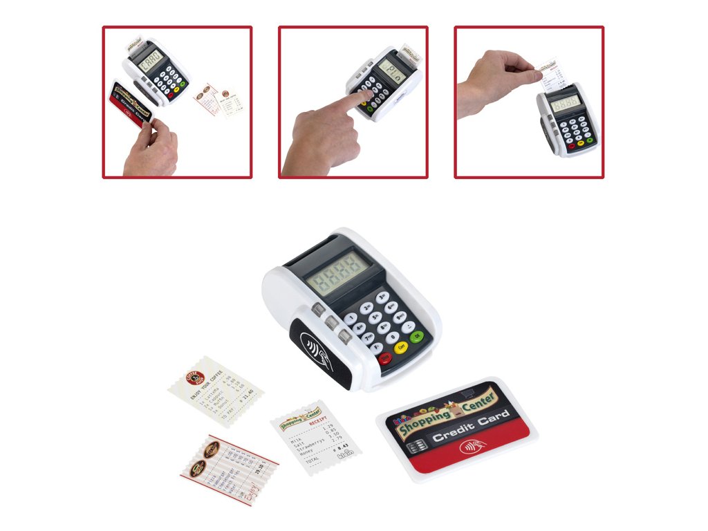 Platební terminál se zvukovými a světelnými efekty. Obsahuje 3 poukazy a 1 kreditní kartu s bezkontaktní funkcí. Baterie nejsou součástí balení. Vhodné od 3 let.