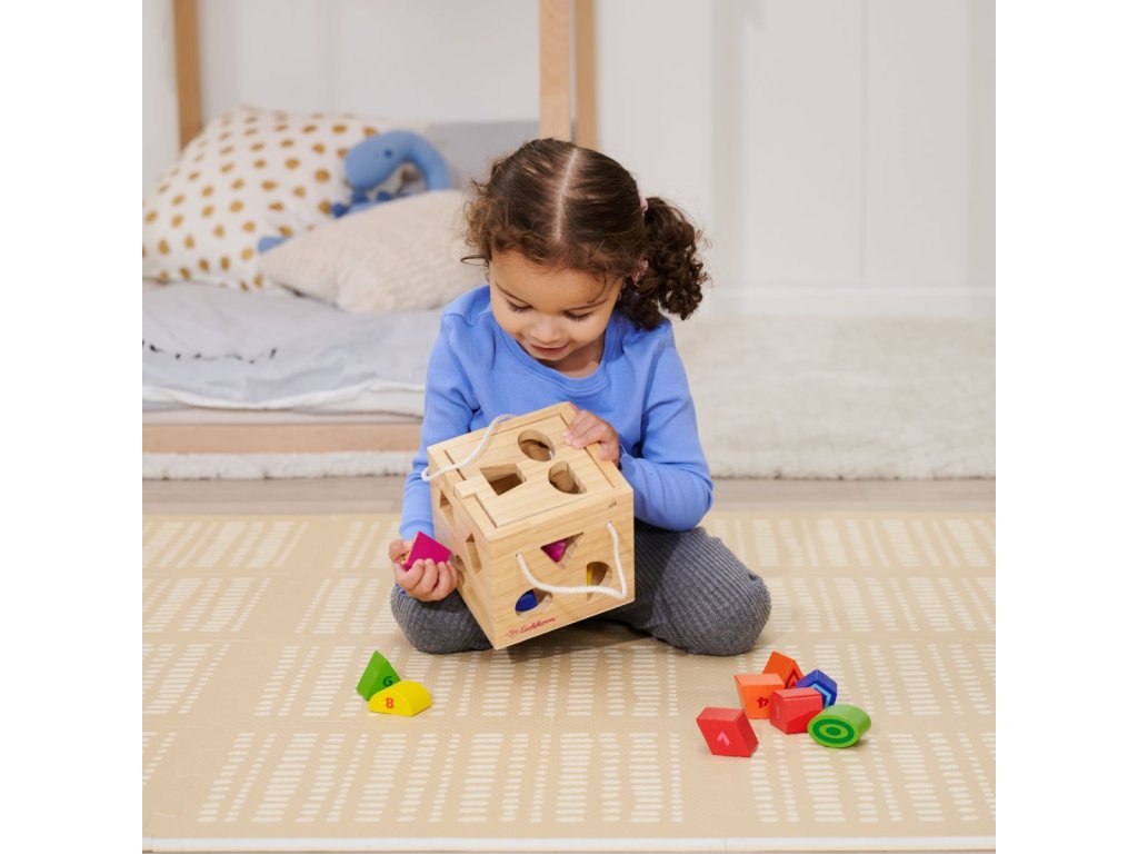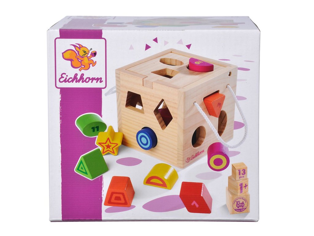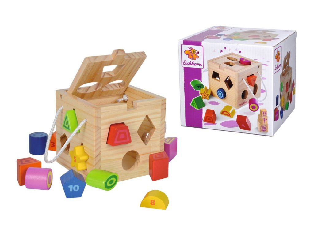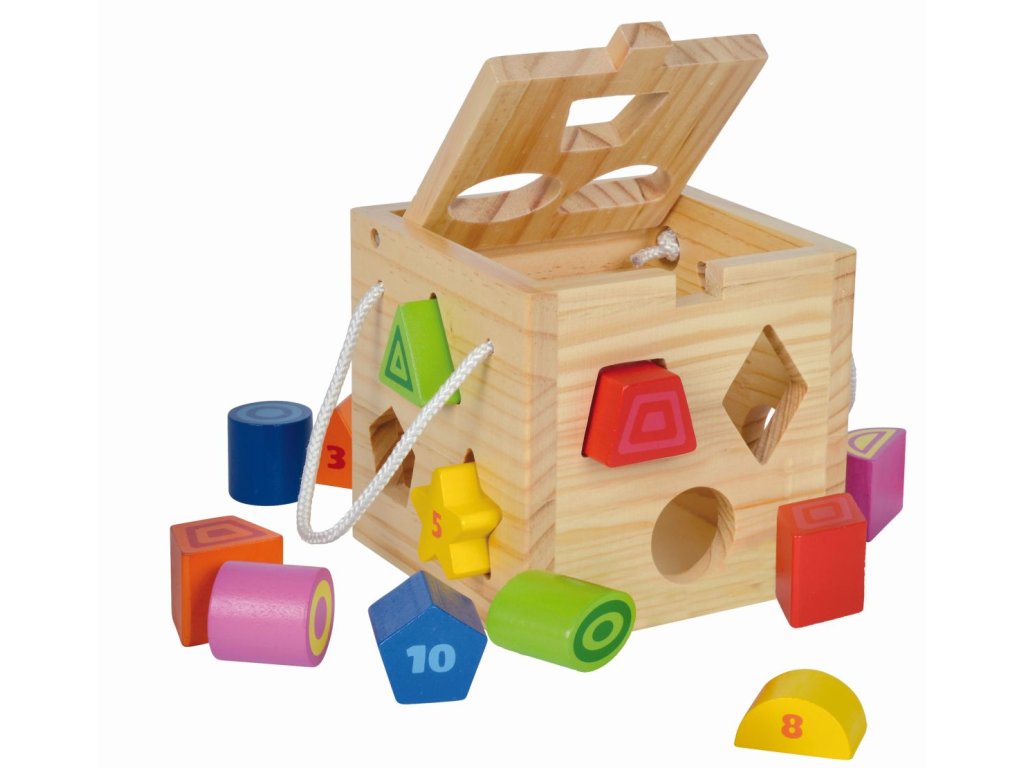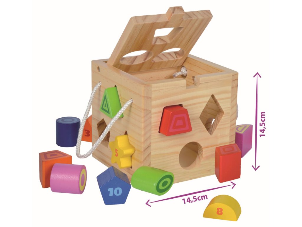 Dřevěná otevírací kostka - vkládačka, 12 různě barevných tvarů na vkládání.