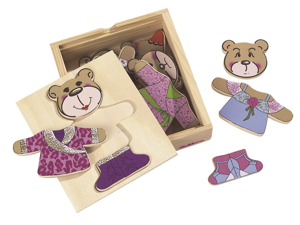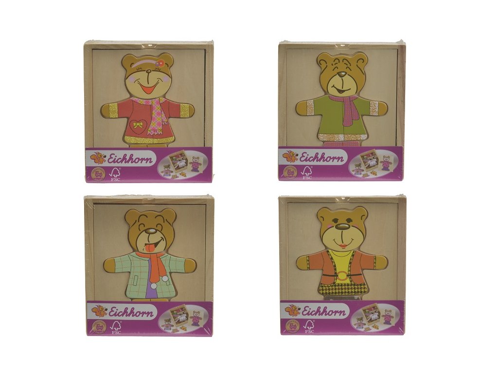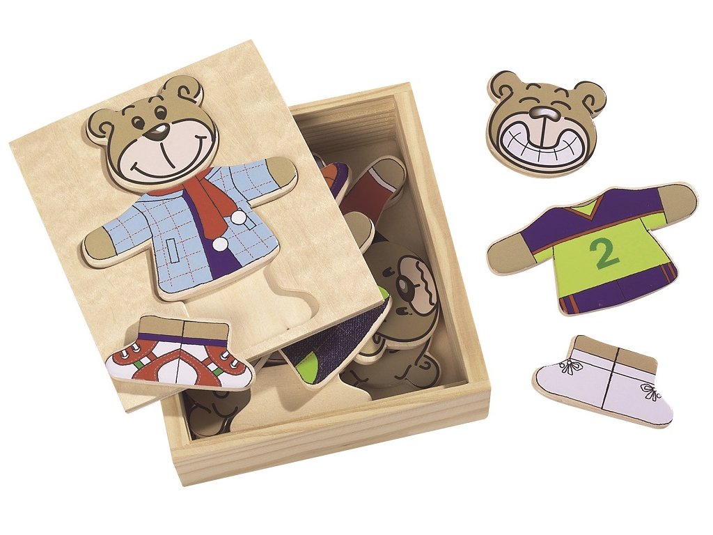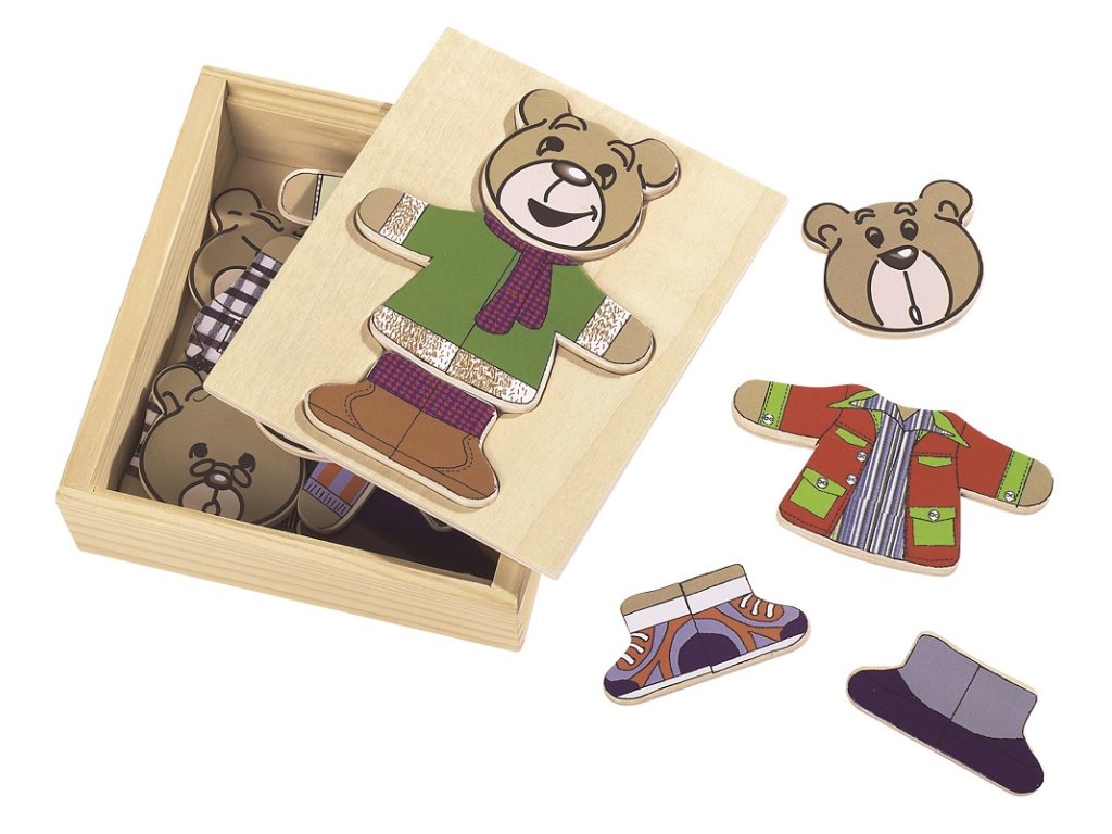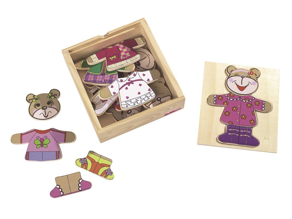 Oblékni si svého medvídka! Sada v dřevěném boxu obsahuje 20 dílů. Velikost boxu 14 x 14 cm.