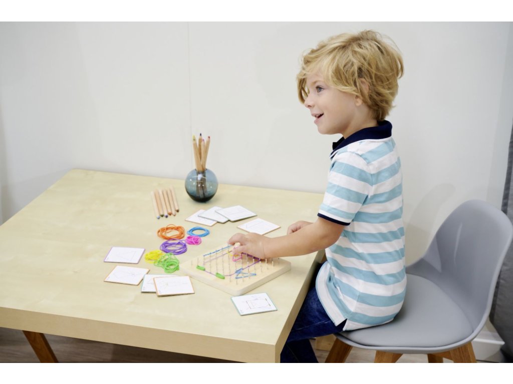 Montessori geometrická deska se 64 hřebíky a 60 barevnými gumičkami je skvělá sada pro podporu jemné motoriky a kreativity. Vaše dítě si může vymyslet postavičku podle svého přání nebo vytvořit motiv pomocí 24 karet s úkoly s různými úrovněmi obtížnosti. Geometrická deska je praktická a lze ji vzít kamkoli – do auta, do restaurace nebo k přátelům – ideální společník na cesty. Montessori geodeska o rozměrech 18×18 cm je vyrobena ze 100% lipové překližky s certifikátem FSC a je vhodná pro děti od 4 let.