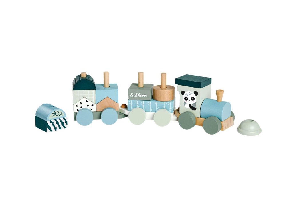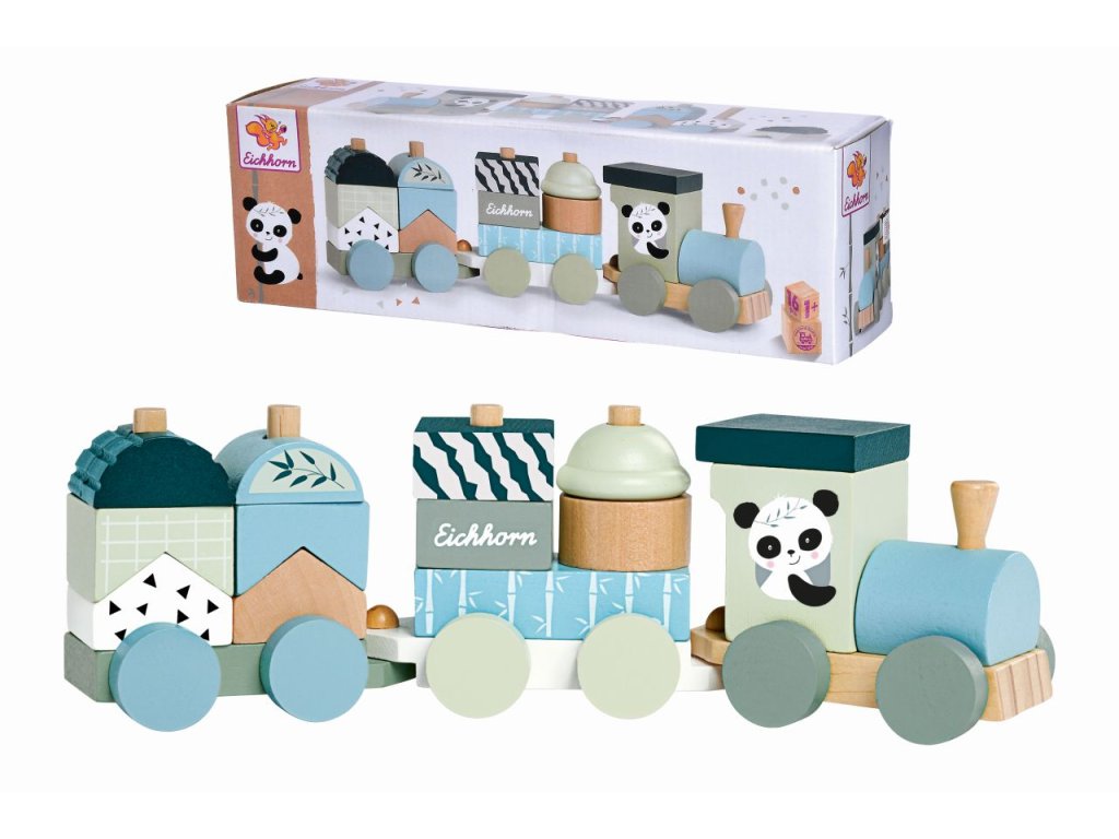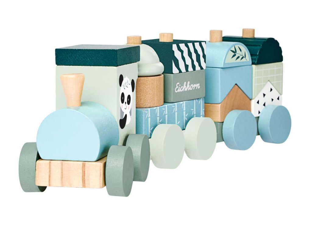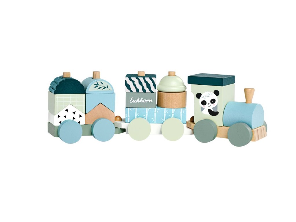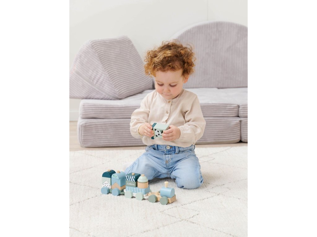 Dřevěný vláček s 2 vagónky a 13 kostičkami různých tvarů. Délka 29 cm. Materiál bříza.