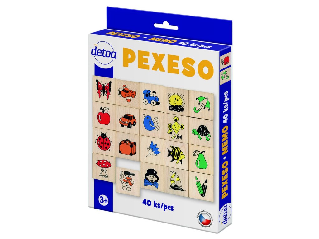 Dřevěné pexeso s barevnými obrázky pro procvičení soustředění a paměti. Hra obsahuje 40 kusů o velikosti 40 x 40 x 10 mm. Baleno v krabici z tvrdého papíru. Nevhodné pro děti do 3 let. Obsahuje malé části. Výrobek je zdravotně nezávadný.