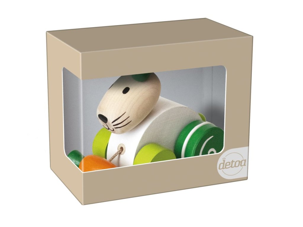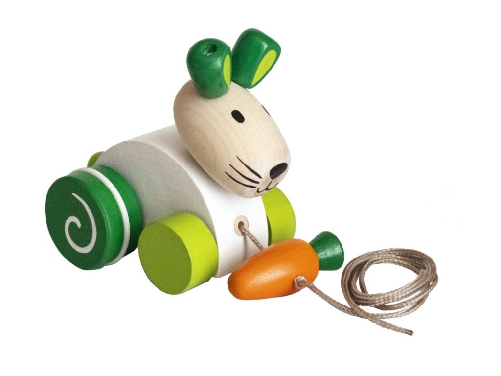 Tahací hračka v podobě zajíce nesoucí si mrkev.