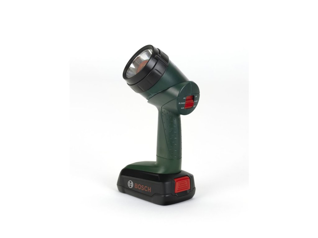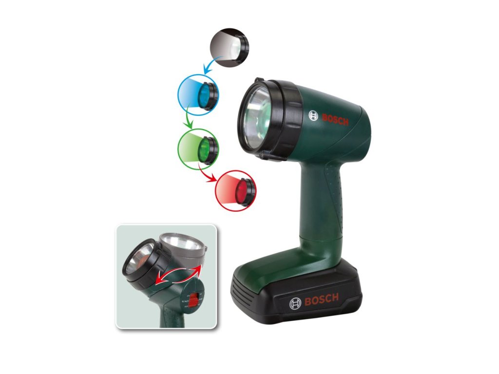 Svítilna Bosch. Otáčením sklíčka na baterce se mění barva světla. Baterka svítí bíle, modře, zeleně nebo červeně. Rozměr balení 15,5x7x26,5 cm. Vhodné pro děti od 3 let.