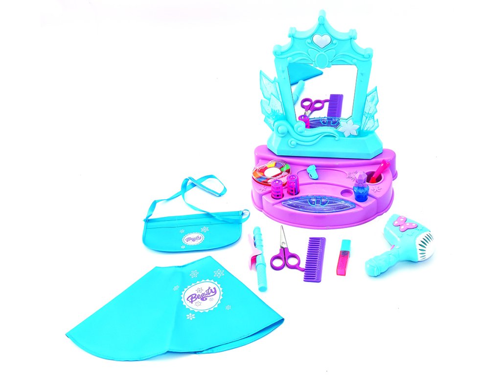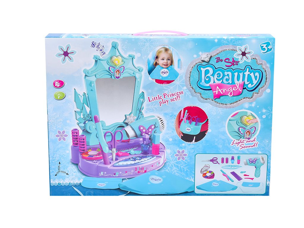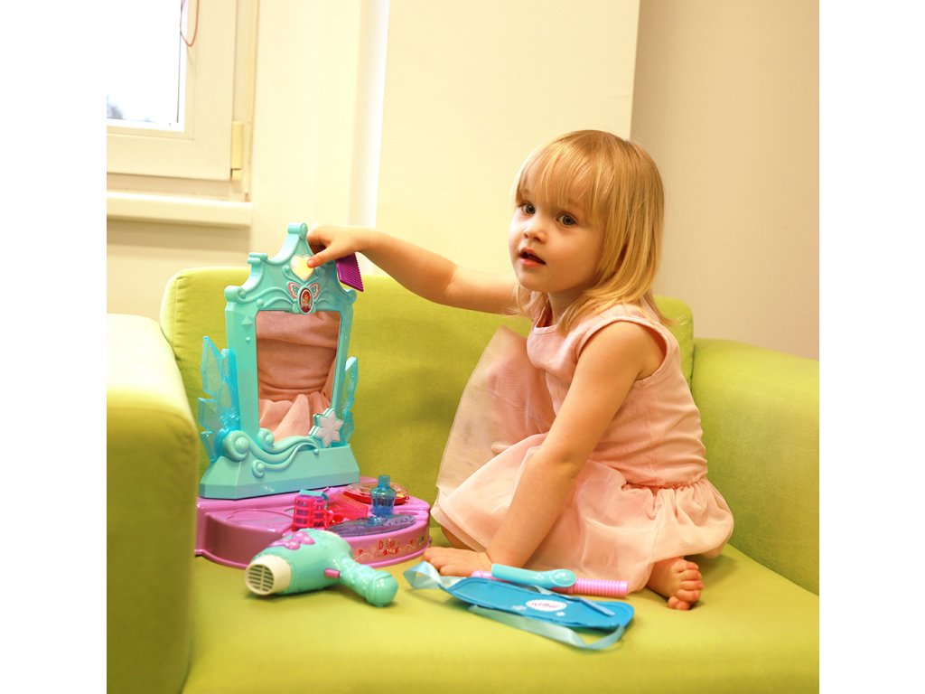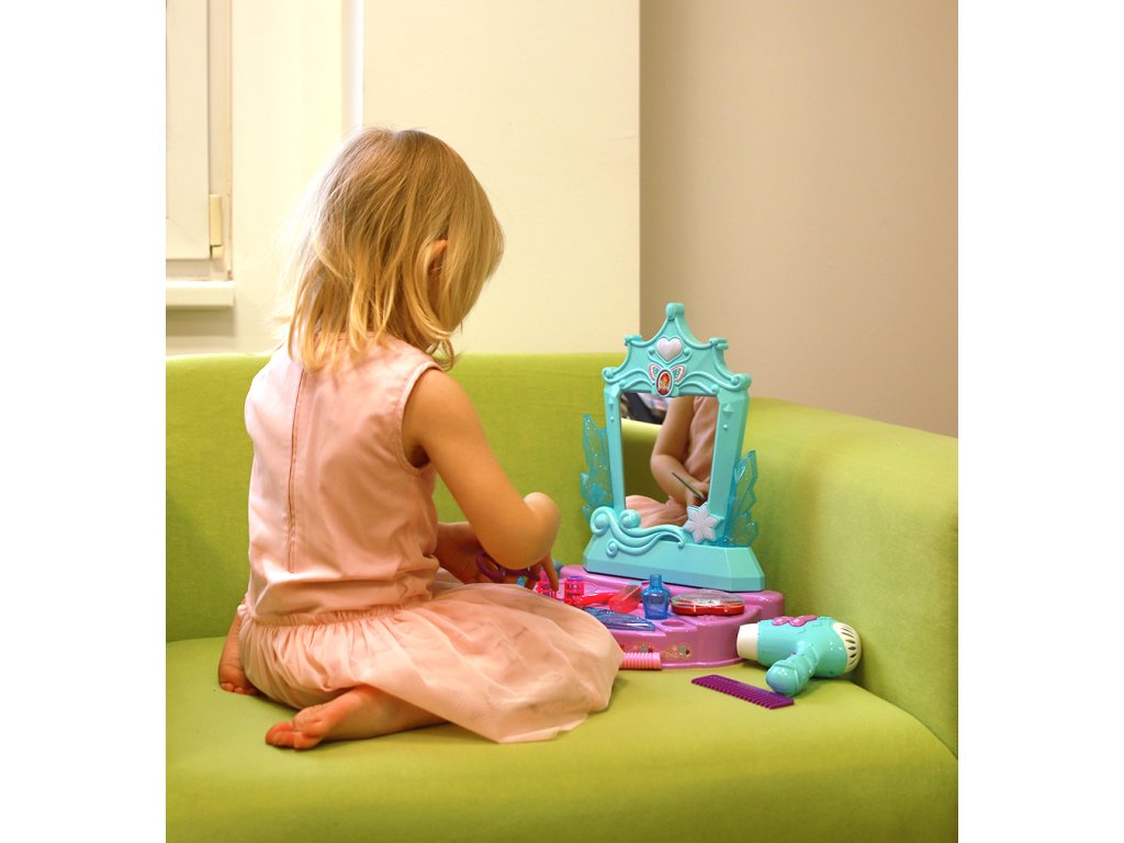 Toaletní zrcadlo s funkčním fénem. Zrcadlo hraje melodii. Součástí velké množství příslušenství (malovátka, sponky…)