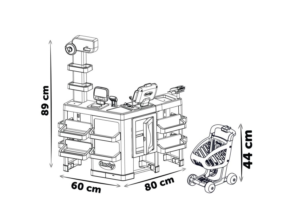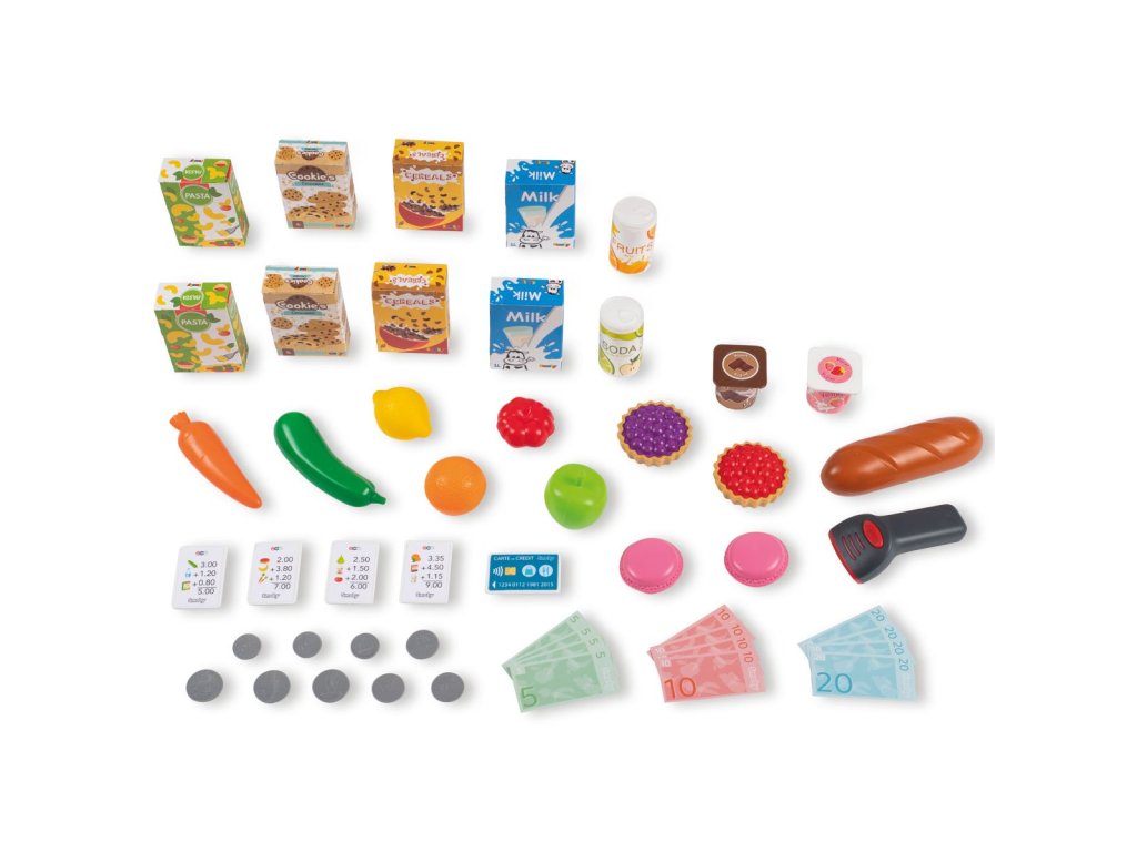 Maxi market s pokladnou, nová mechanická váha (zobrazená hmotnost se upravuje podle vážených potravin), hodiny a panel otevřeno/zavřeno. Bohaté příslušenství, např.makety krabiček (cereálie, těstoviny, sušenky, mléko), 2 plechovky, 2 jogurty, 6 ovoce a zeleniny, 2 makronky, 2 koláče, 1 chléb, 1 elektronický snímač čárových kódů se zvukem a světlem, 4 účtenky, 1 kreditní karta, 9 mincí a 12 bankovek. Celkem obsahuje 50 ks příslušenství. Rozměry: 80x60x90 cm. Nákupní vozík součástí. Vyrobeno ve Francii.