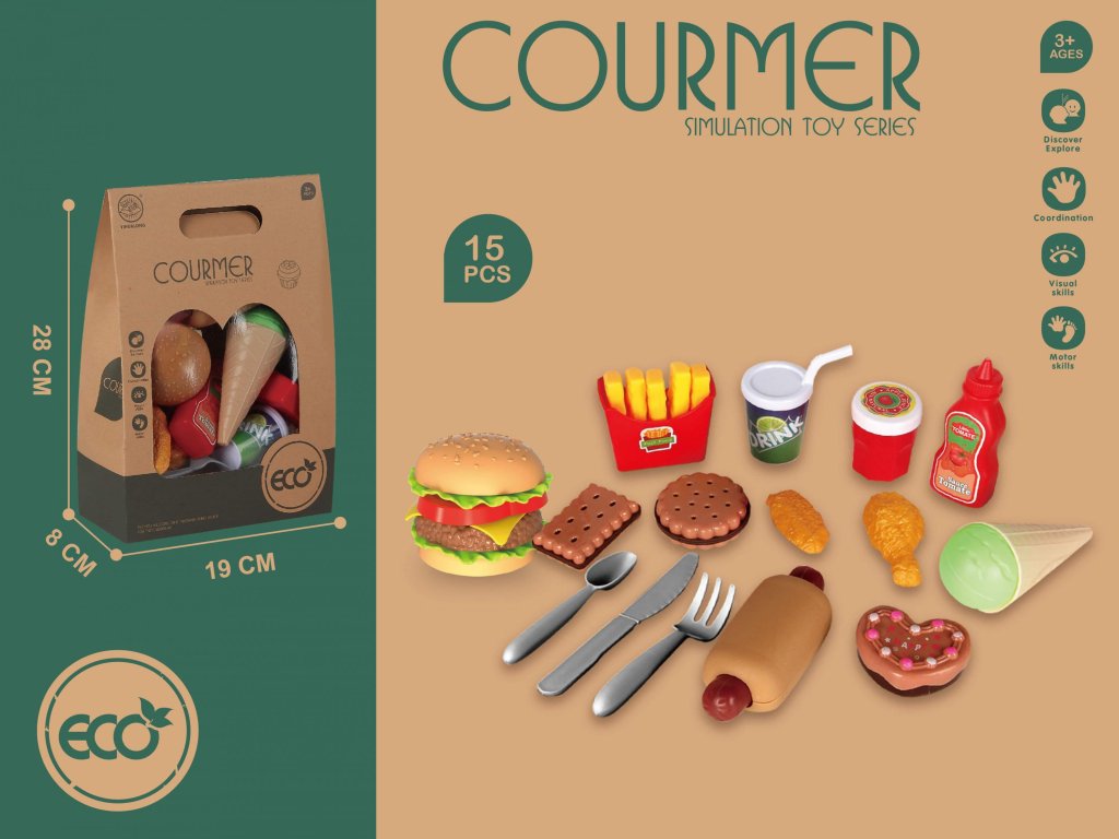PLEJO Obědový set - Hamburger je zábavná a interaktivní sada plastových imitací jídla, která dětem umožňuje hrát si na přípravu a podávání hamburgerů. Tato sada je skvělým doplňkem do dětské kuchyňky a podporuje kreativní hru a rozvoj jemné motoriky.