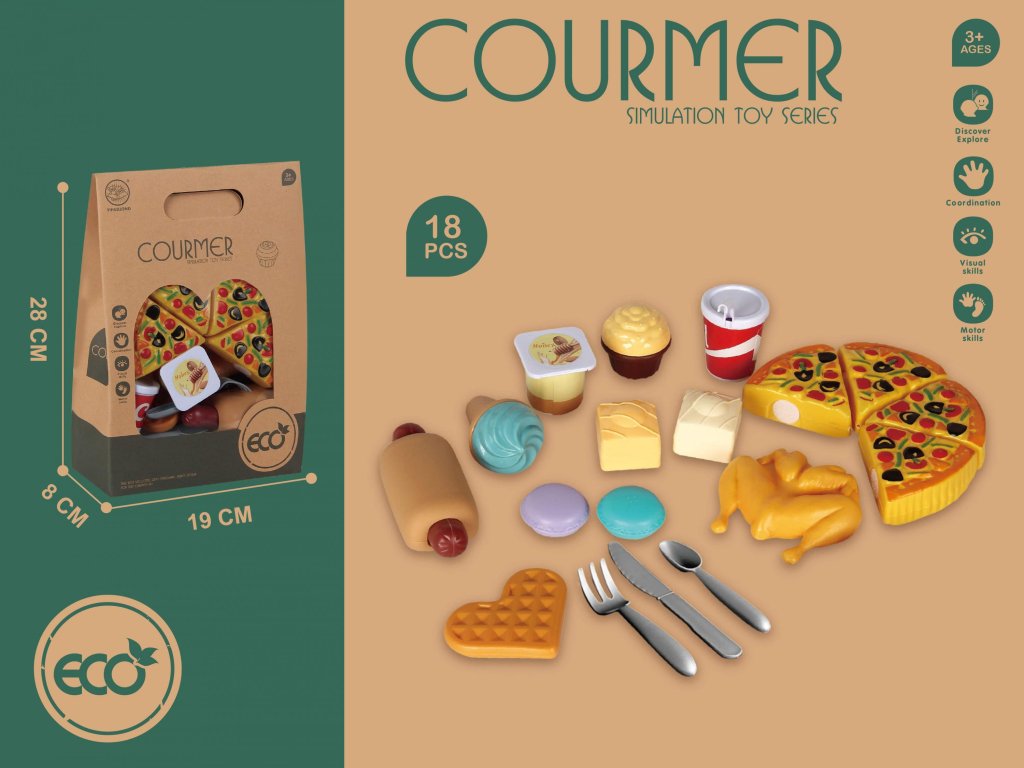 PLEJO Obědový set - Pizza, kuře je zábavná a interaktivní sada plastových imitací jídla, která dětem umožňuje hrát si na kuchaře nebo na hosty v restauraci. Tato sada s tématem pizzy a kuřete je skvělým doplňkem do dětské kuchyňky a podporuje kreativní hru a sociální interakci.