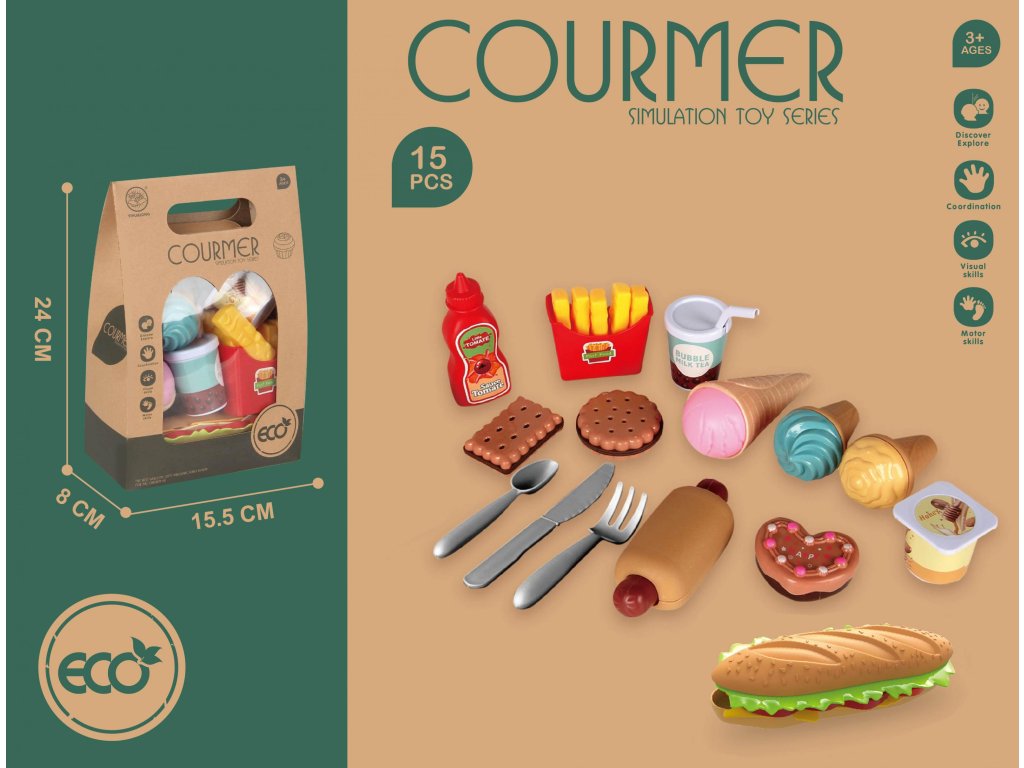 Barevné a detailně zpracované imitace potravin a nádobí působí pro děti atraktivně a podporují realistickou hru.