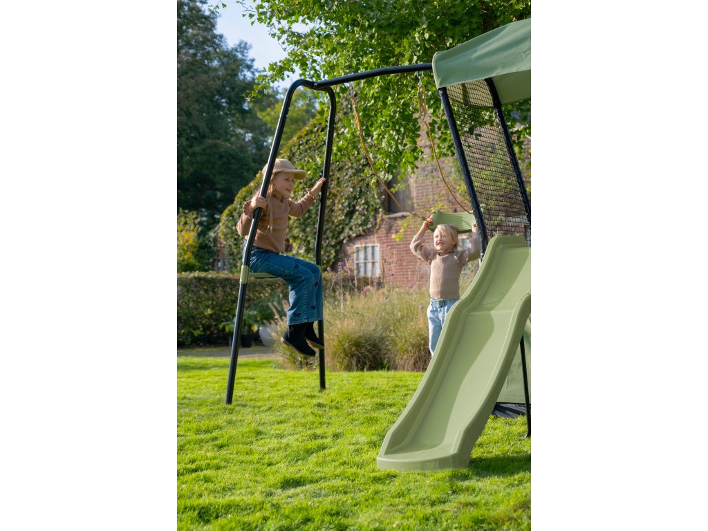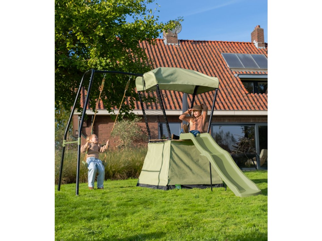 multifunkční venkovní věž Ivy má skluzavku a hrací stan, který lze přeměnit na pískoviště. Tato kompaktní venkovní herní věž, tedy nabízí mnoho herních možností, aniž by zabírala mnoho místa na vaší zahradě. Věž má moderní vzhled, díky černému rámu a jemně zelené střeše, spodnímu stanu a skluzavce, proto se hodí do každé zahrady