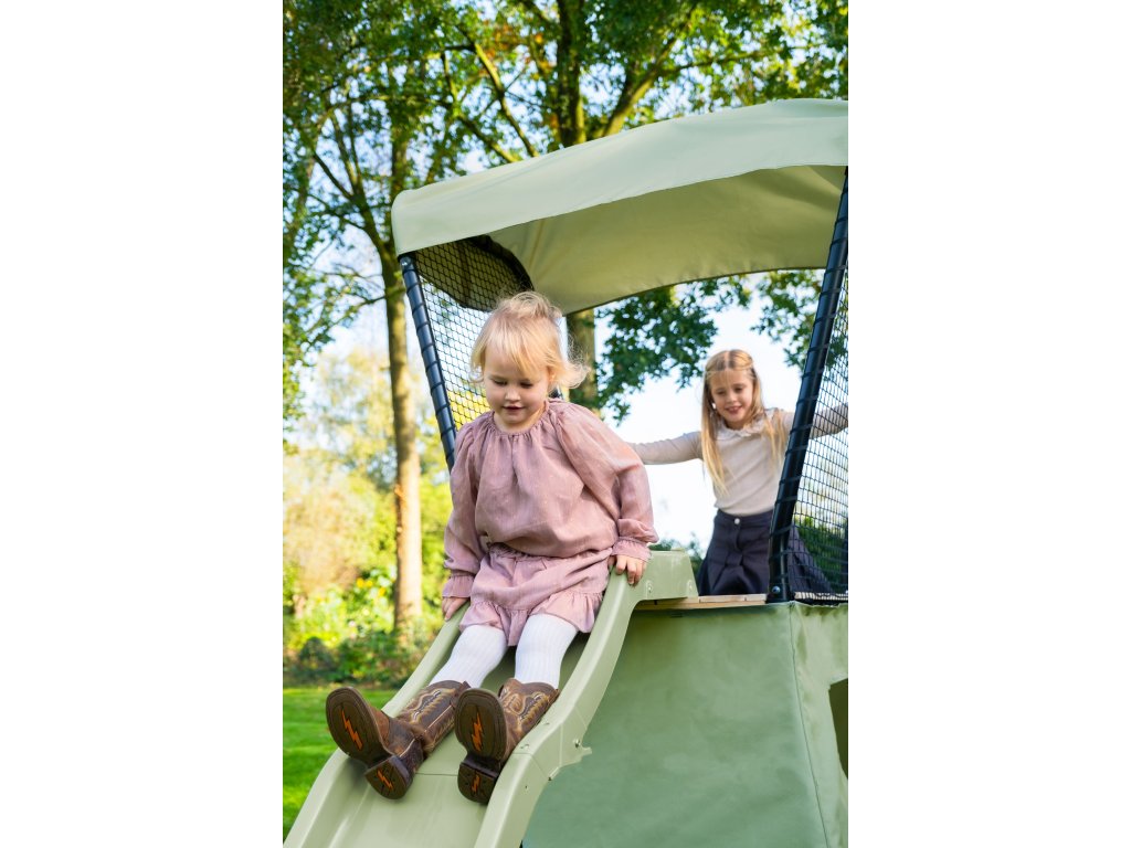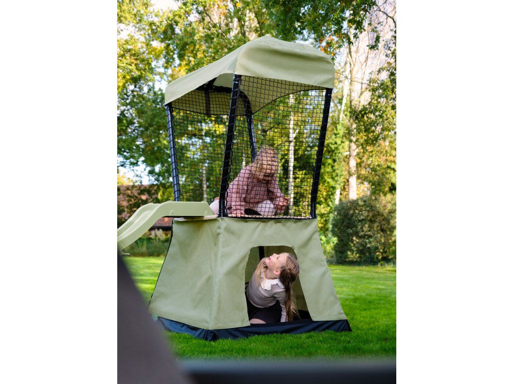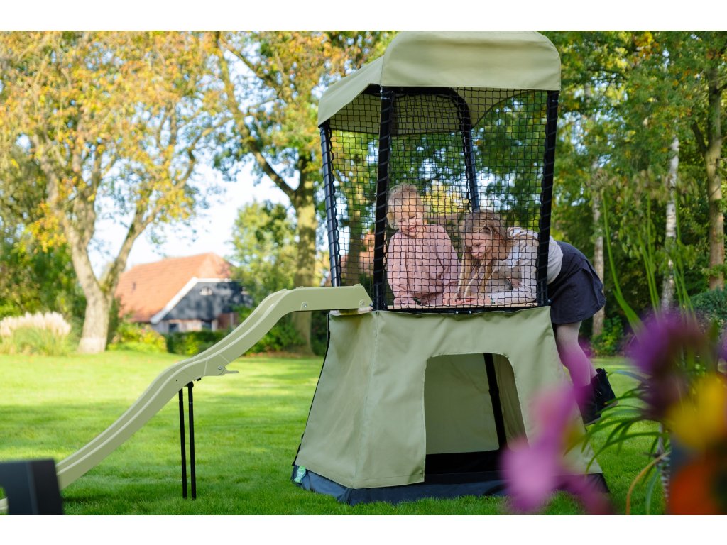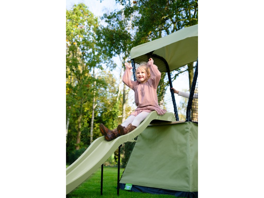 multifunkční venkovní věž Ivy má skluzavku a hrací stan, který lze přeměnit na pískoviště. Tato kompaktní venkovní herní věž, tedy nabízí mnoho herních možností, aniž by zabírala mnoho místa na vaší zahradě. Věž má moderní vzhled, díky černému rámu a jemně zelené střeše, spodnímu stanu a skluzavce, proto se hodí do každé zahrady