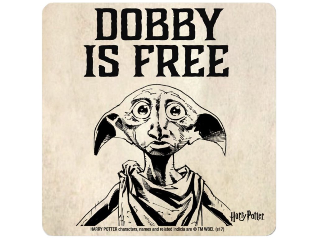 Sběratelský tácek pod sklenice, vyvedený v grafice skřítka Dobby a nápisem Dobby is free.