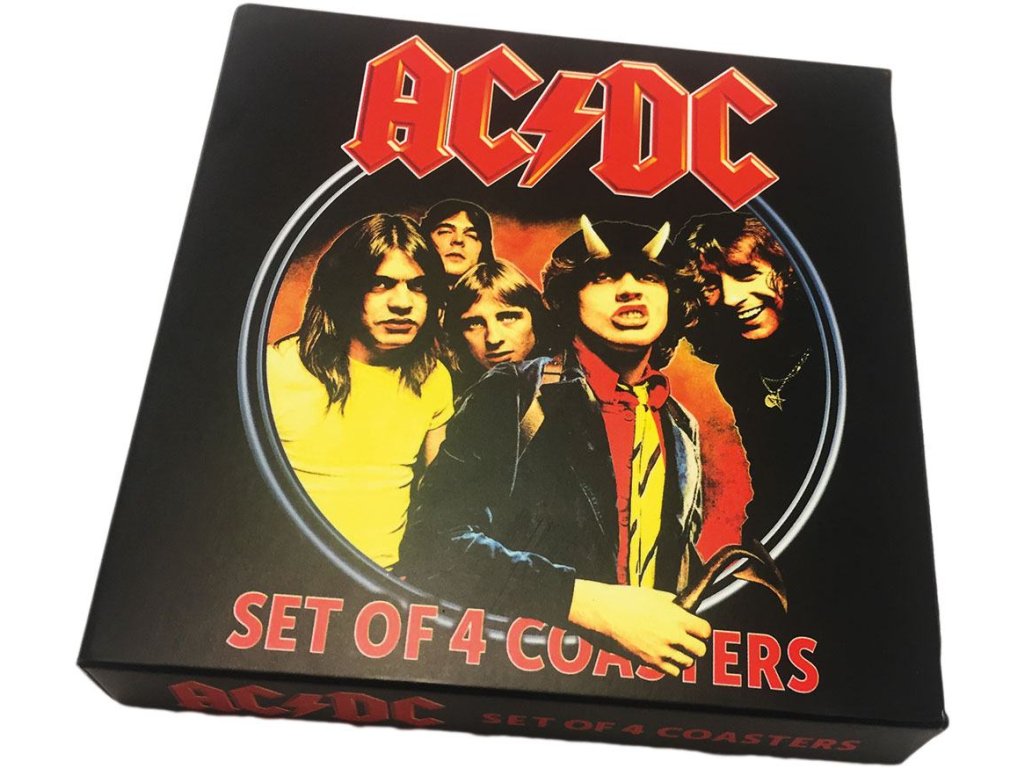 Set čtyř tácků pod sklenice, s grafikou a logem australské rockové hudební skupiny AC/DC.