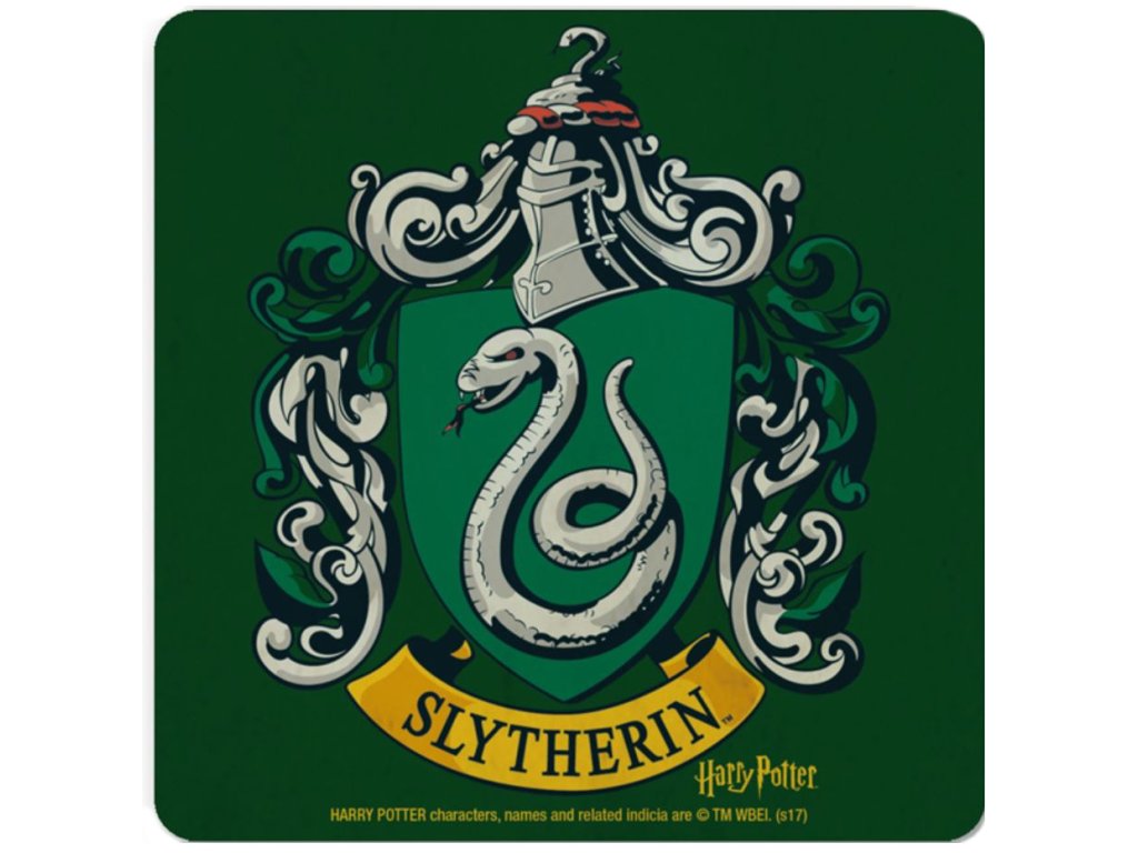 Sběratelský tácek pod sklenice, vyvedený v grafice a s logem erbu koleje Slytherin.