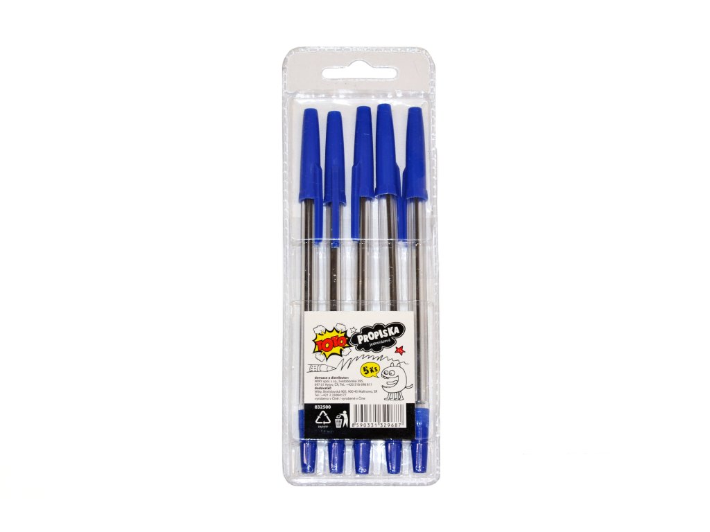 Sada modrých jednorázových propisek značky TOTO pro psaní ve škole nebo volném čase. V balení je 5 kusů