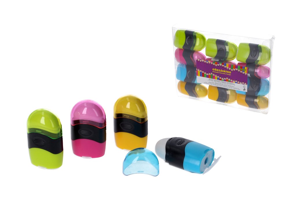 Ořezávátko na jednu tužku s gumou o velikosti 3x2x6 cm.