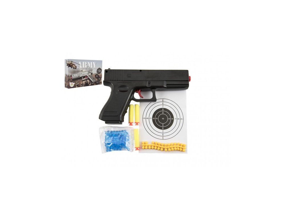 "Hravá zábava především pro kluky! Pistole na pěnové náboje, vodní i gumové kuličky zabaví každého pistolníka. Vlož kuličky, nabij, zamiř a střílej. Velikost kuliček je 6 mm.