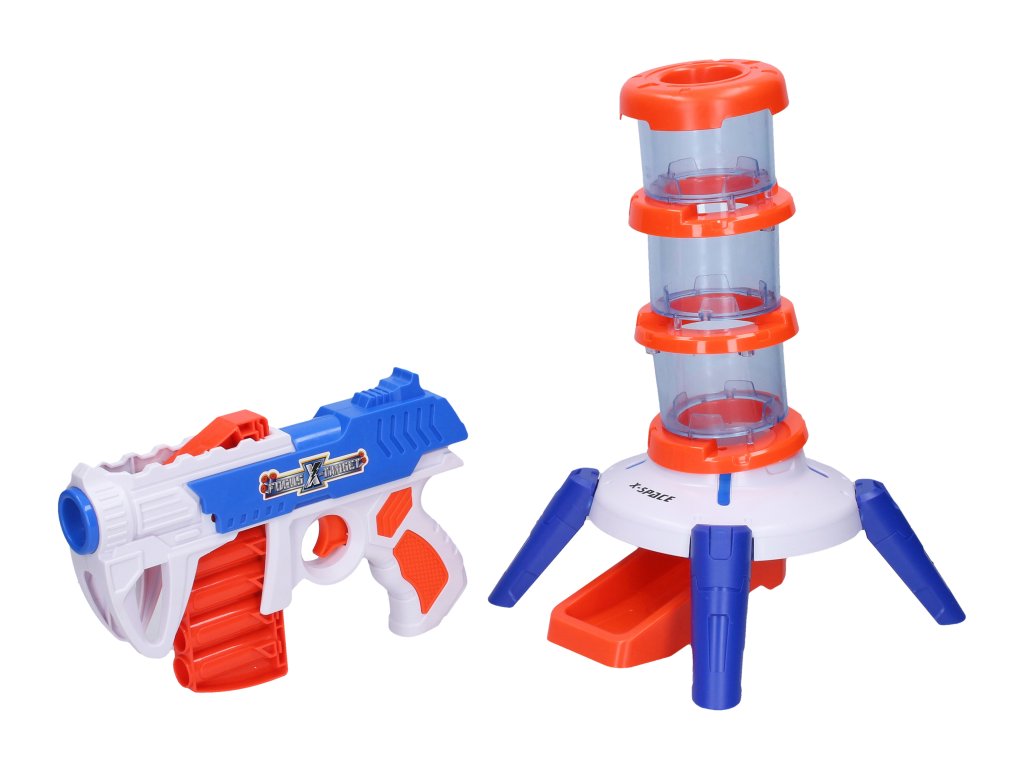 Pistole na pěnové náboje věž s terči. Rozměry 33,5 x 19,5 cm. Návod na složení věže na obalu. Posuvný vertikální zásobník na 6 nábojů. 12 nábojů v balení.