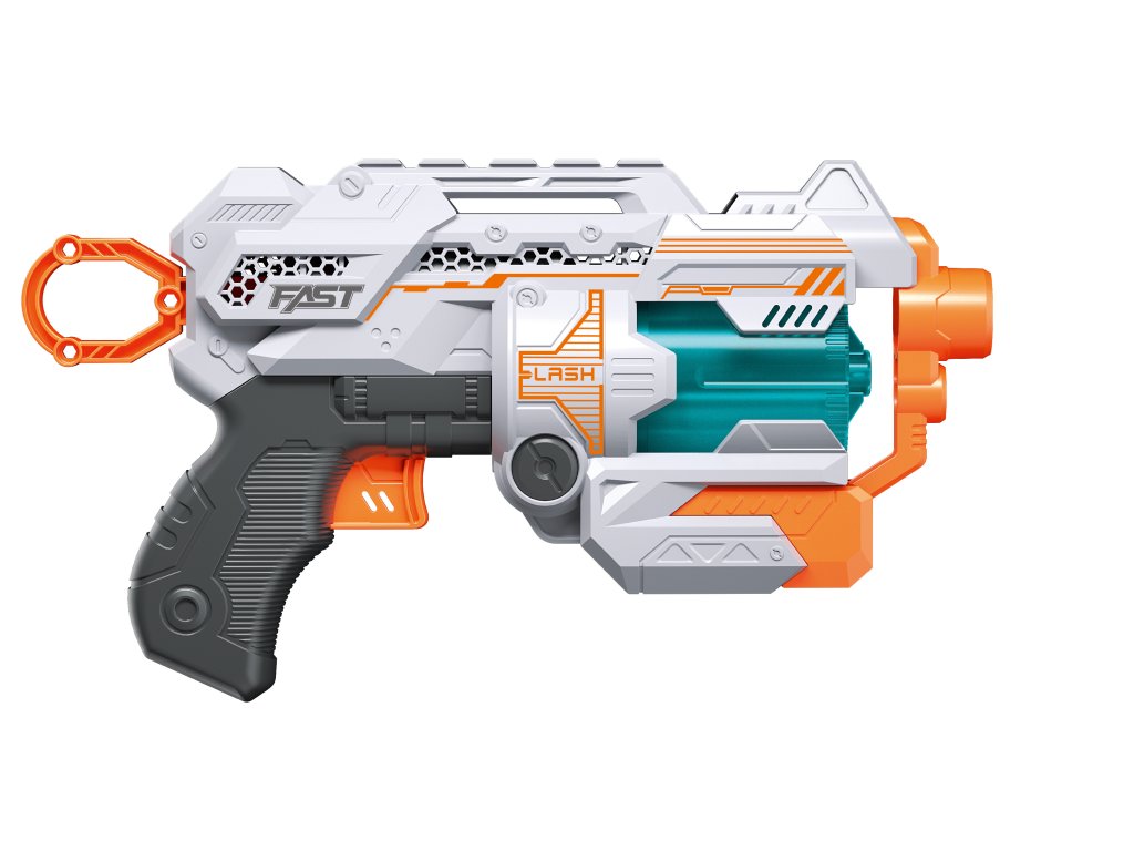 Pistole s 12 pěnovými náboji. Rozměry 25x6x14 cm. Natahovací nabíjení. Obrázkový návod na použití na přední straně obalu.