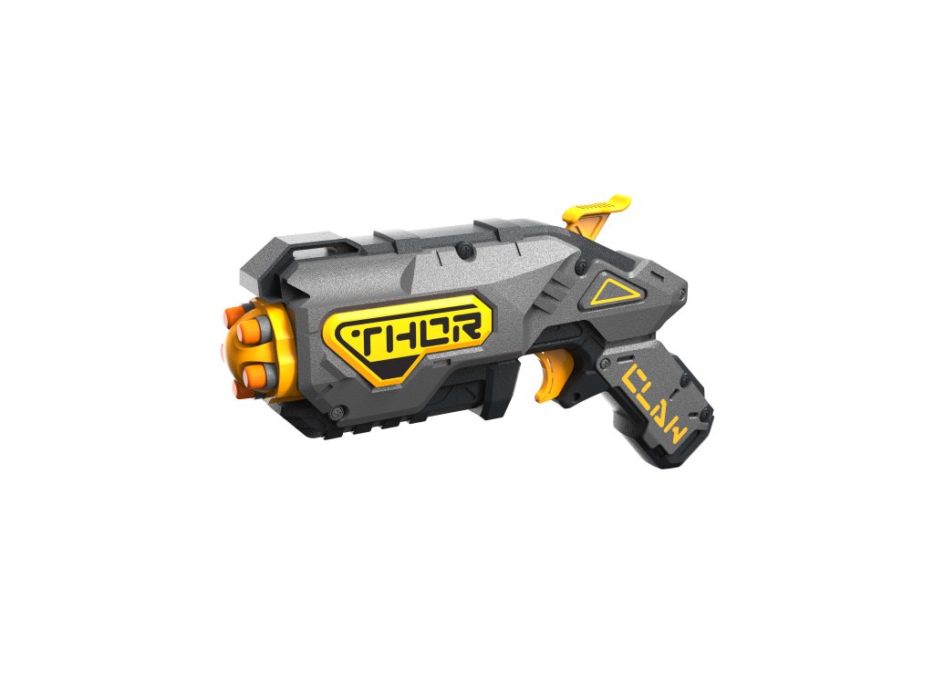 Pistole s 20 pěnovými náboji. Rozměry 27x5x15 cm. Zásobník na 5 nábojů. Náboj se vloží do zásobníku v hlavni, natáhne se kohoutek dolů a vystřelí spouští. Obrázkový návod na zadní straně obalu.