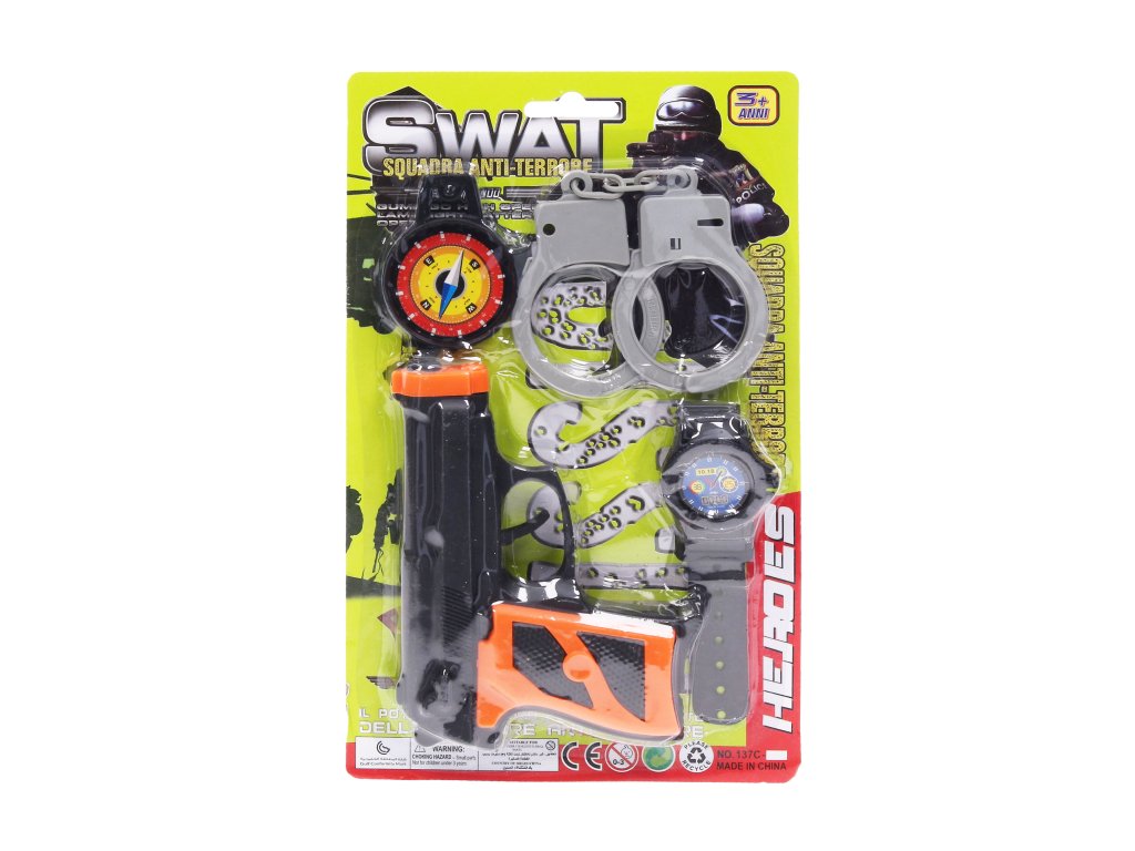Policejní set. Rozměry pistole 16x11 cm. Součástí pistole, kompas, pouta, hodinky.