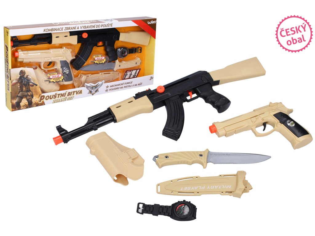 Puška sada pouštní bitva. Obsah balení - samopal 52 cm, pistole s pouzdrem 20 cm, nůž s pouzdrem 25 cm, hodinky. Samopal a pistole vydávají akustické zvuky při stisku spouště, bez baterií. Samopal se nabíjí páčkou na levé straně.