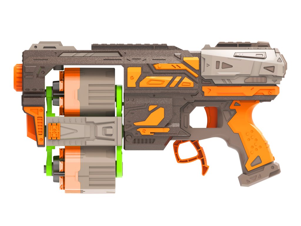 Puška se 14 pěnovými náboji. Rozměry 33,5x7x18,5 cm. 2 zásobníky, každý na 6 nábojů. Zásobník lze vyjmout. Páka pod kohoutkem - prohození zásobníků. Nabíjení natáhnutím zadní části zbraně. Dostřel 23 m. Obrázkový návod s popisem na zadní straně obalu.