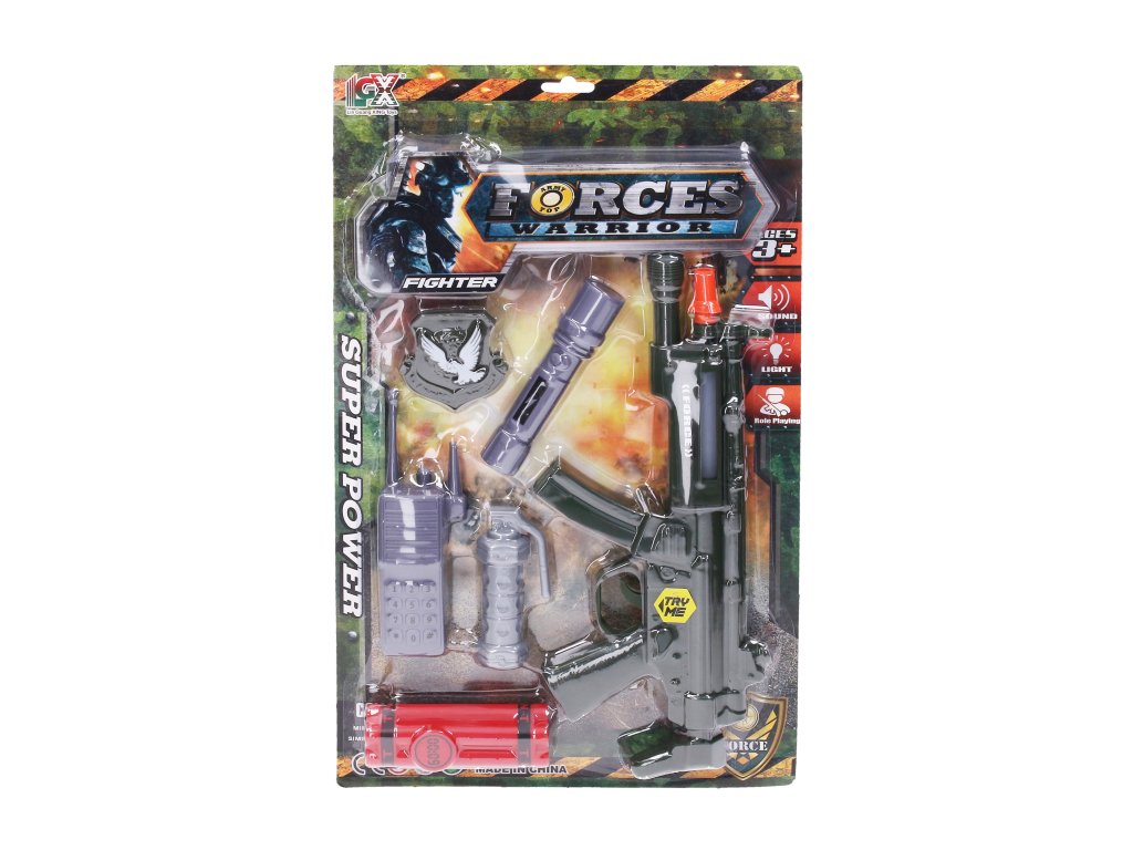 Vojenský set. Rozměry pušky 30x14 cm. Součástí puška, odznak, svítilna, vysílačka, granát, dynamit. Světelné a zvukové efekty pušky. 3xAG13 baterie součástí.