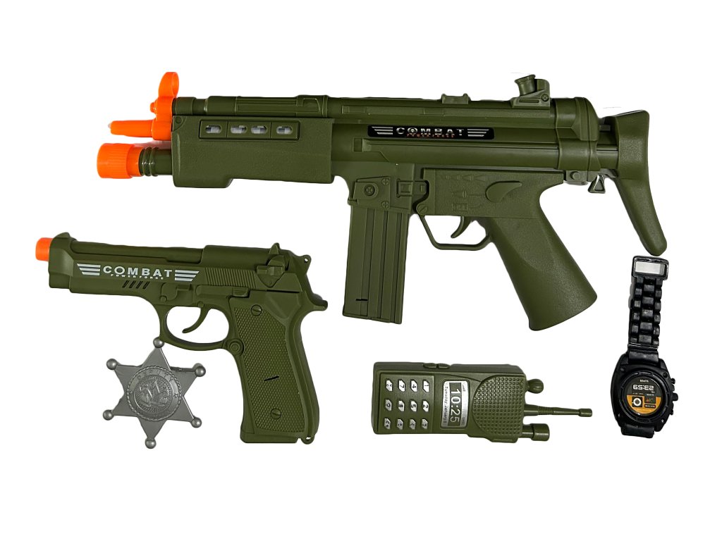 Vojenský set se samopalem. Obsah balení - samopal 39x17 cm, pistole 20x13 cm, odznak, vysílačka, hodinky. Vydává světelné a zvukové efekty. Samopal - 2xAA baterie, součástí balení.