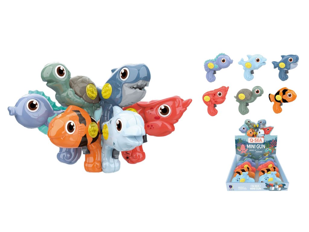Zvířátko se světelnými a zvukovými efekty. Mořská zvířata. Aktivace efektů stiskem spoušti. Display box - 12 ks. Baterie 2xAG13, součástí balení.