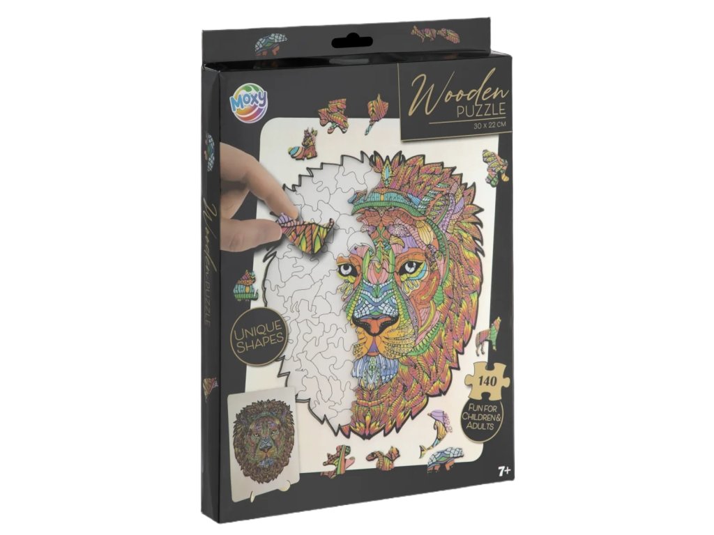 Úžasné puzzle s jedinečnými dřevěnými dílky o velikosti 30x22 cm, každý dílek je unikátní a je ve tvaru různých zvířátek, dílky se skládají do destičky, po složení vznikne z malých zvířátek/dílků obraz jednoho velkého, součástí balení je také praktický stojánek, aby bylo možné dokončenou skládačku patřičně vystavit. Zábava pro děti i dospělé.