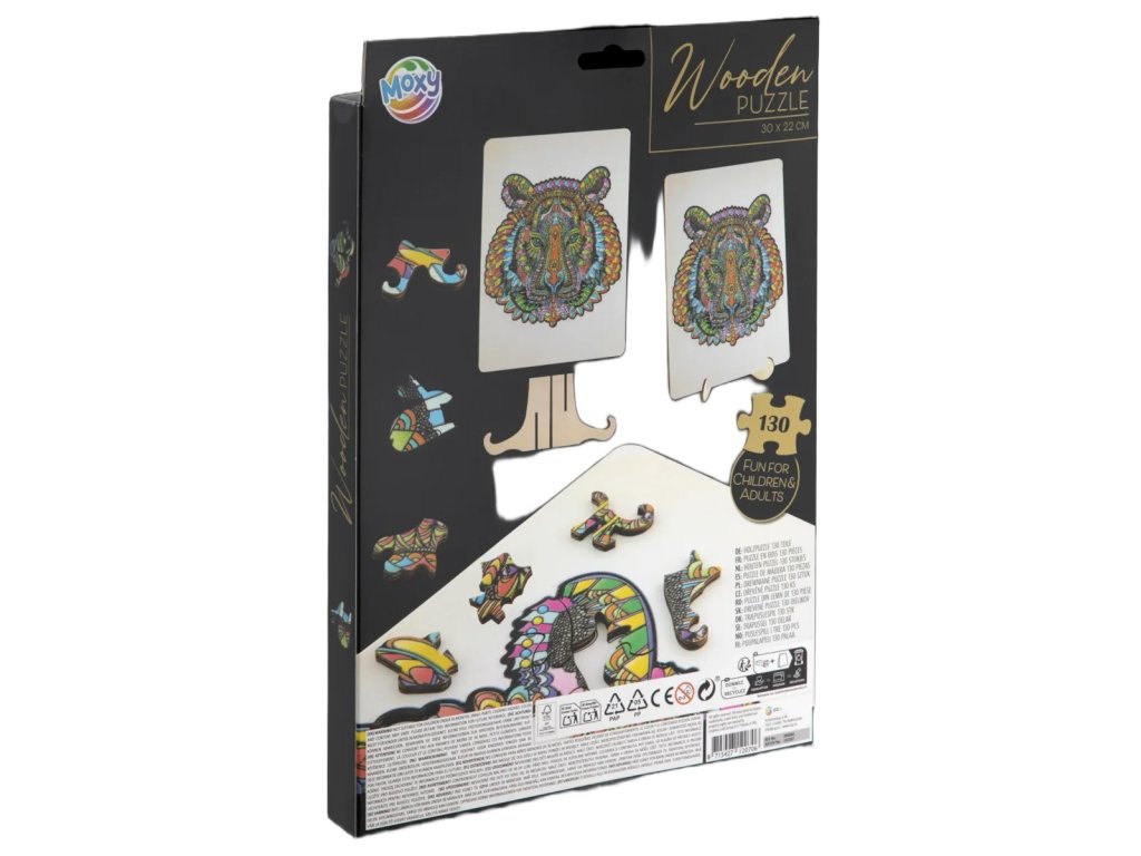 Úžasné puzzle s jedinečnými dřevěnými dílky o velikosti 30x22 cm, každý dílek je unikátní a je ve tvaru různých zvířátek, dílky se skládají do destičky, po složení vznikne z malých zvířátek/dílků obraz jednoho velkého, součástí balení je také praktický stojánek, aby bylo možné dokončenou skládačku patřičně vystavit. Zábava pro děti i dospělé.