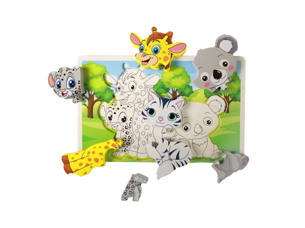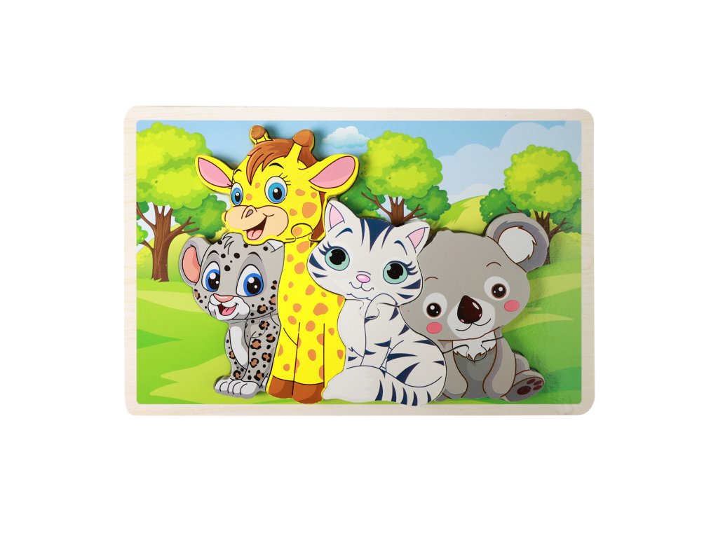 Dřevěné puzzle s motivem zvířátek pro naše nejmenší děti. Skládačka je vyrobena ze dřeva a obsahuje 8 dílků. Pestré barvy a veselá ilustrace podporují rozvoj fantazie, skládání procvičuje motorické vlastnosti a rozvíjí představivost.