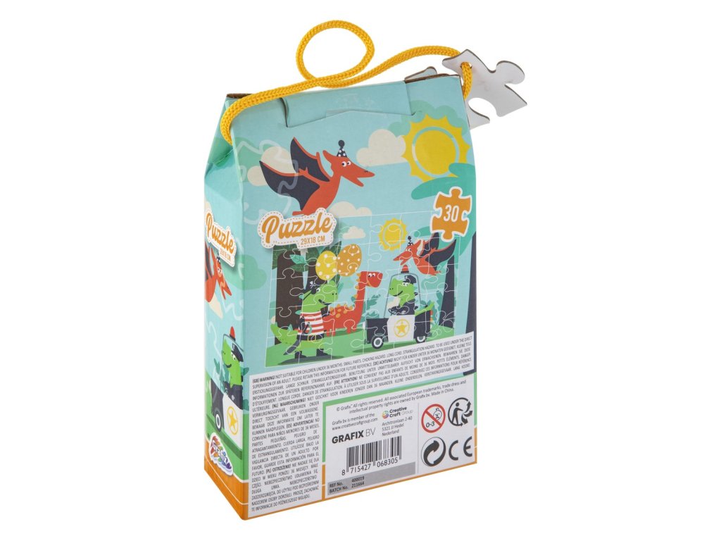 Nádherné dětské puzzle obsahující 30 velkých dílků, které po složení vytvoří obrázek s motivem dinosaurů o rozměru 29x18 cm, baleno v krásné dárkové krabičce s uchem