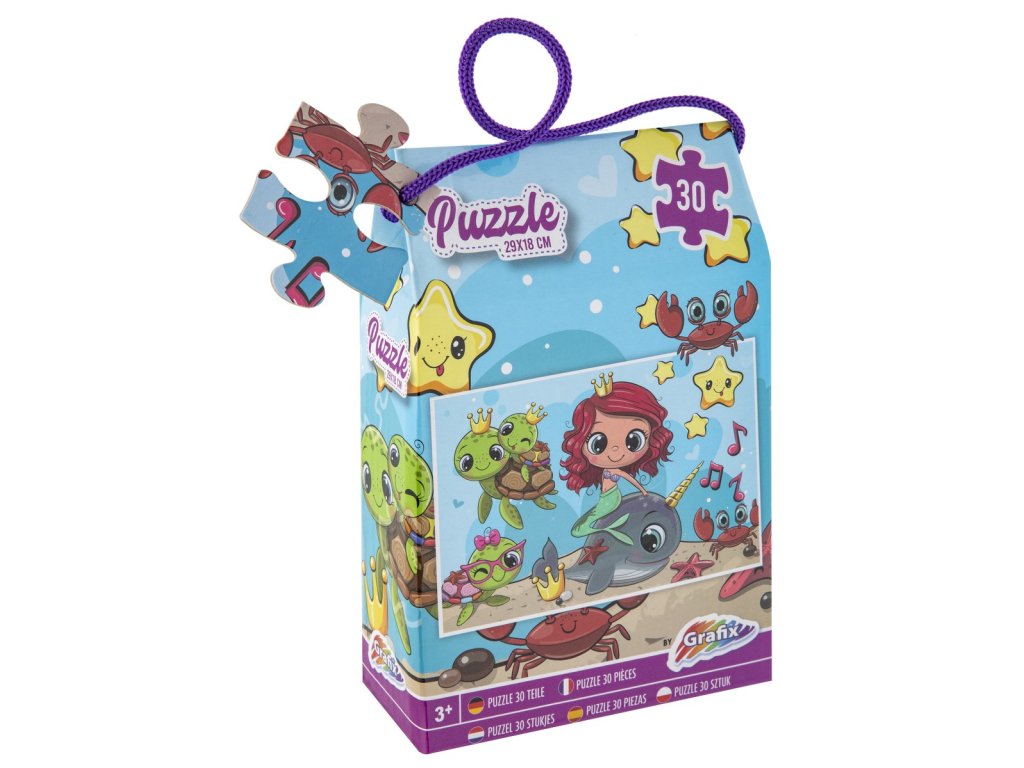Nádherné dětské puzzle obsahující 30 velkých dílků, které po složení vytvoří obrázek s motivem mořské víly zvířátek z podmořského světa o rozměru 29x18 cm, baleno v krásné dárkové krabičce s uchem