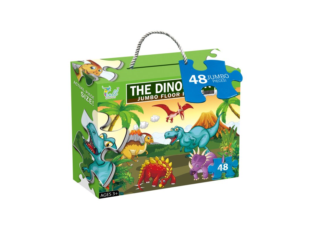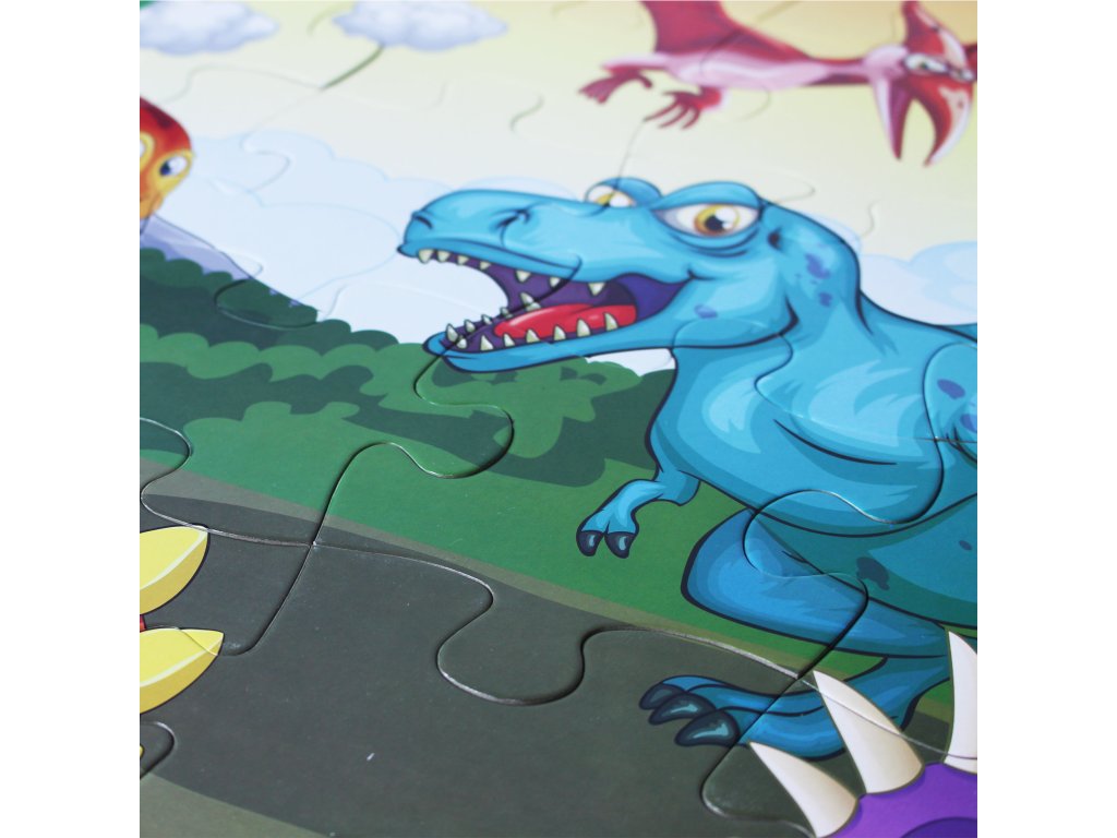 Podlahové puzzle pro děti s motivem dinosaurů. Balení obsahuje 48 dílů, jednotlivé dílky jsou dost velké pro snadný úchop. Výsledný obrázek má velikost 92 x 62 cm. Vhodné pro děti od 3 let.
