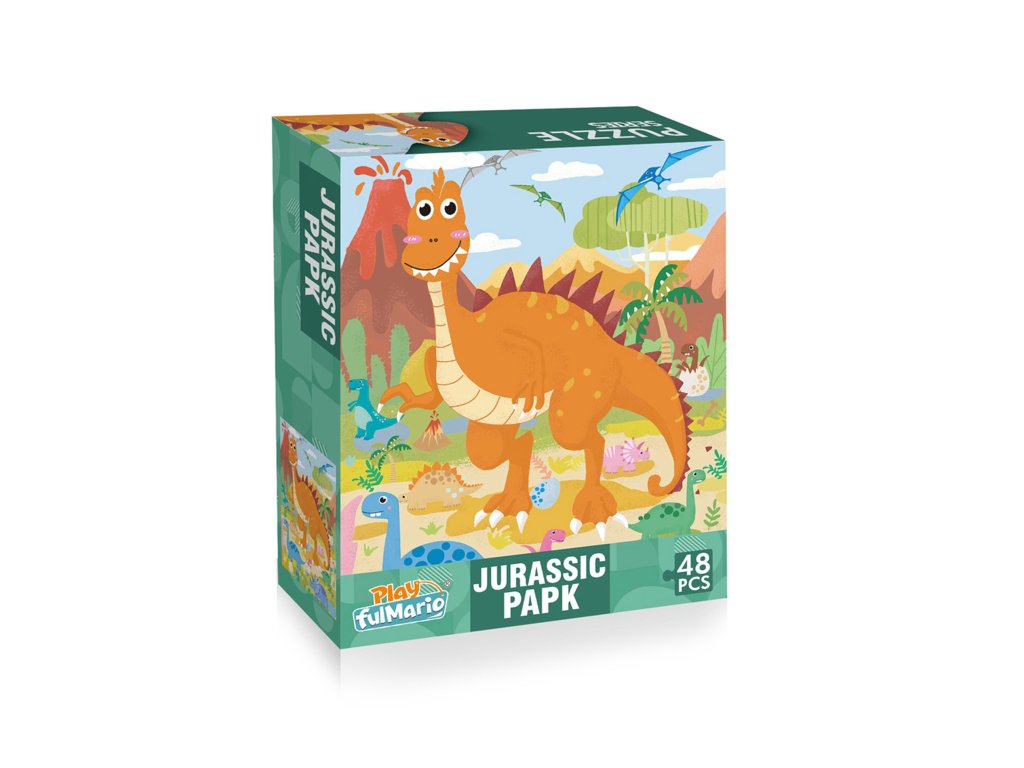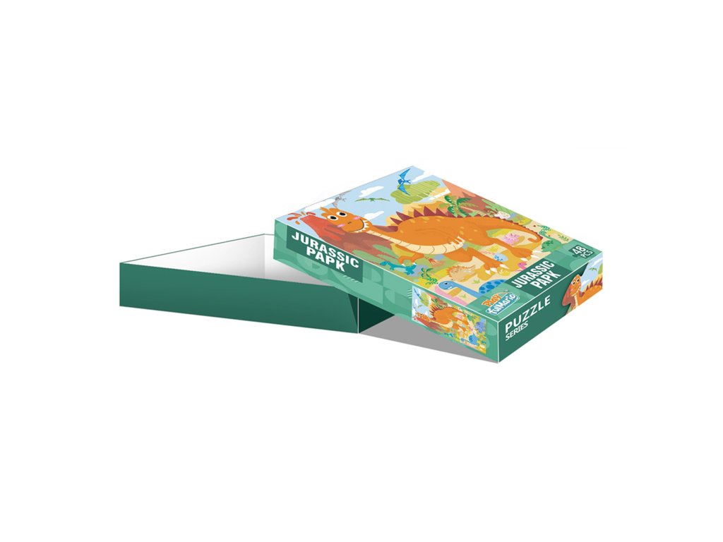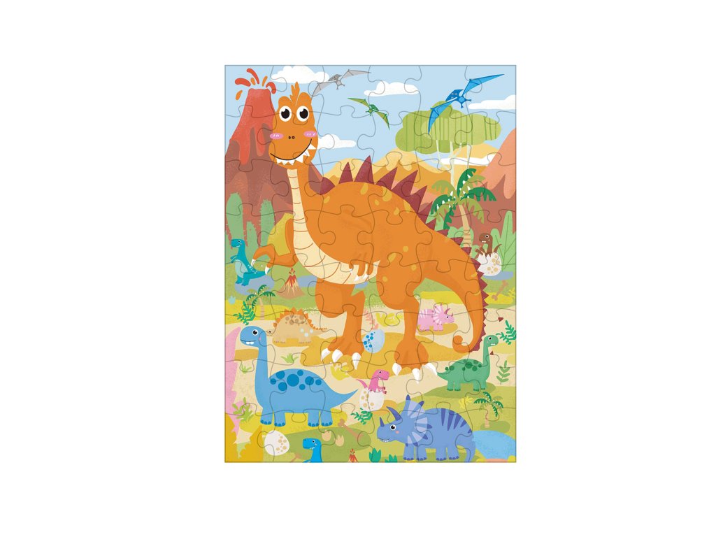 Tyto puzzle s motivem dinosaurů obsahují 48 dílků. Výsledný obrázek je velký 60 x 44 cm, jednotlivé dílky jsou dostatečně velké pro snadný úchop dětí již od 3 let. Rozvíjí myšlení a kreativitu.