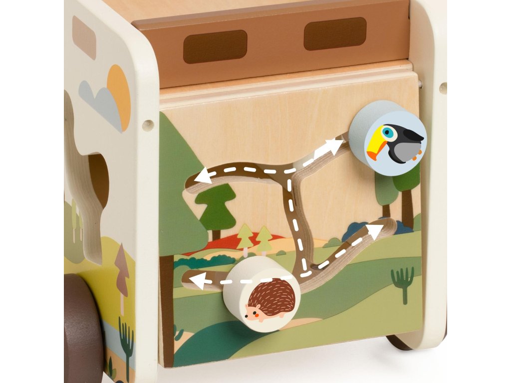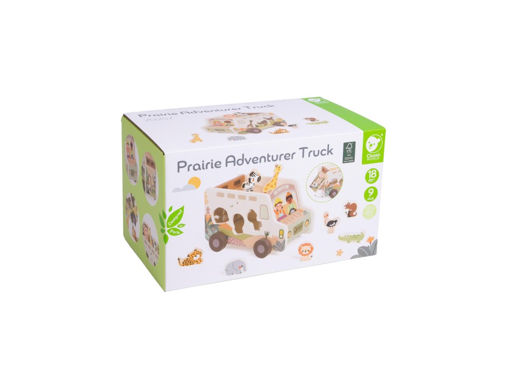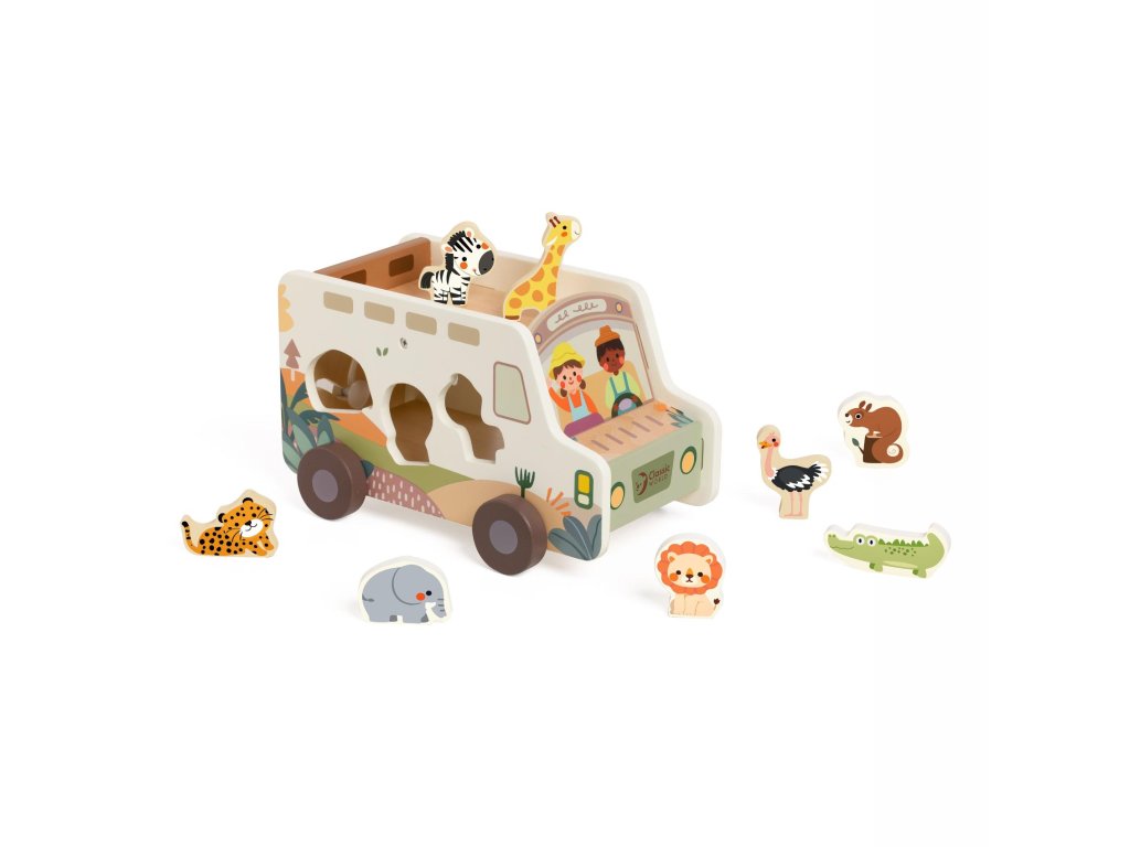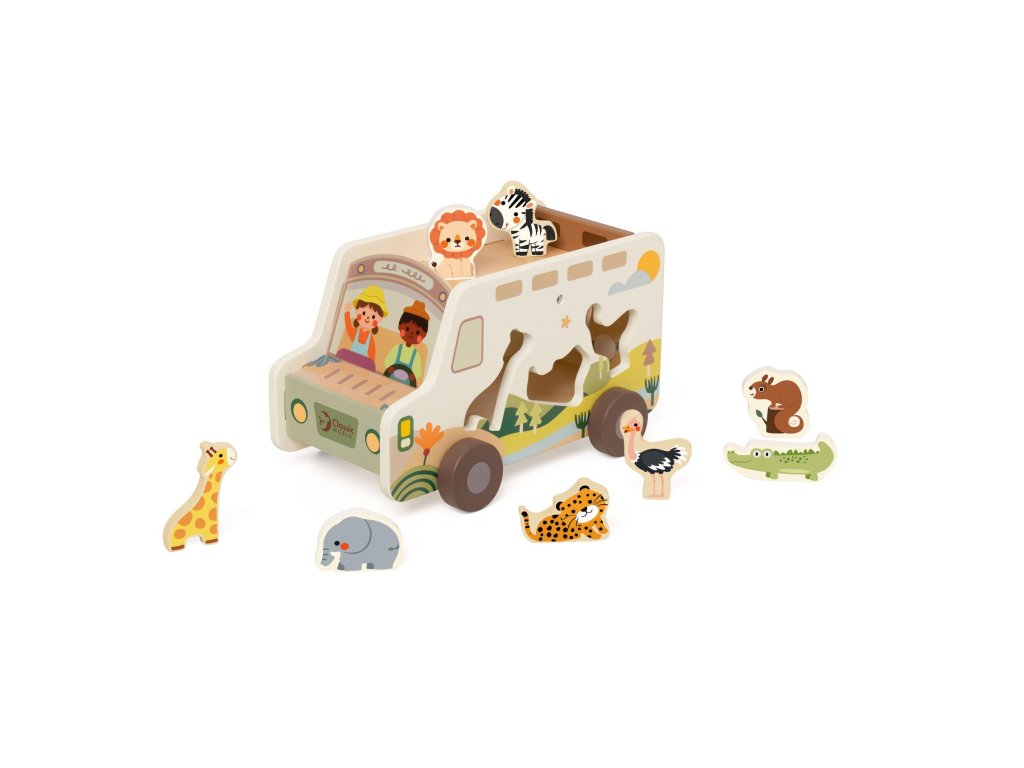 Vydej se na dobrodružnou výpravu savanou se safari autem plným zvířátek! Tato dřevěná vkládačka kombinuje hru s poznáváním – děti přiřazují zvířátka do správných otvorů, rozvíjejí jemnou motoriku, koordinaci i prostorovou představivost. Každý dílek je navržen tak, aby padl do malých dětských rukou. Vozidlo je zároveň úložným prostorem, do kterého si děti mohou zvířátka po hře zase uklidit. Veselý design s ilustracemi a příjemné barvy podporují chuť k objevování. Rozměr balení: 28 × 16 × 16 cm Vhodné pro děti od 18 měsíců.