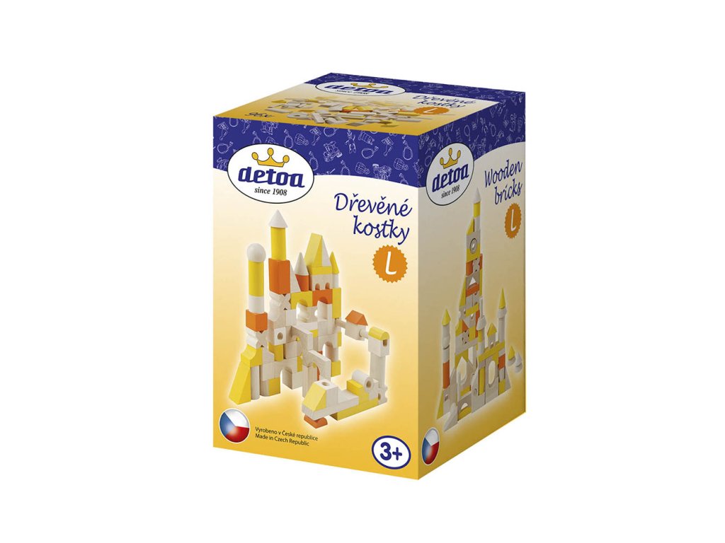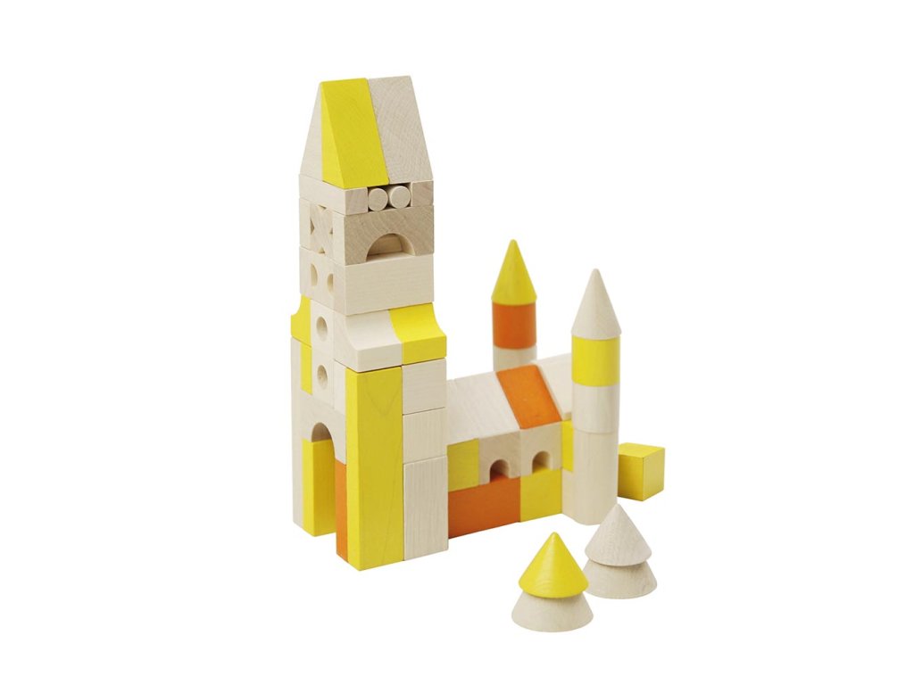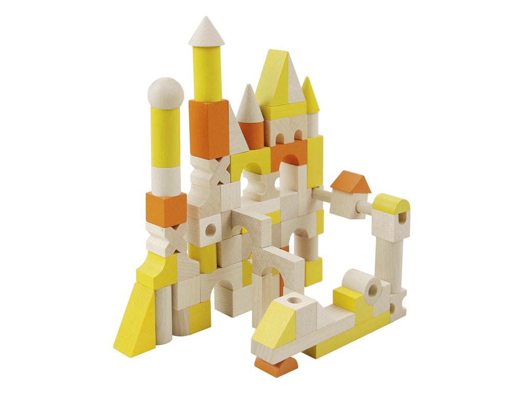 Inovovaná stavebnice skládající se z různých tvarů a velikostí dřevěných dílků v barevném provedení žluto-oranžovém. Kromě klasických krychlí, kvádrů a válečků obsahuje také tyčky, jehlany, "X"ka a další tvary. Některé jsou navíc provrtané. Díky tomu můžete postavit úžasné stavby.Stavebnice obsahuje 96 dílků. Základní velikost krychle je 20mm. Výrobek je vhodný pro děti od 3 let. Obsahuje malé dílky. Výrobek splňuje požadavky EU na bezpečnost hraček. Sada je balena do tvrdé lepenkové krabice. Rozměr balení je 120x120x180mm.