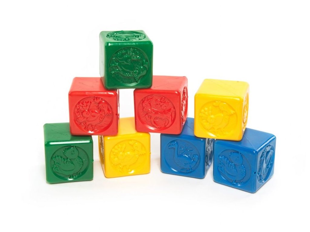 Čtyři různé druhy plastových kostek pro děti, které rozvijí motoriku dětí. Hrací plastové kostky