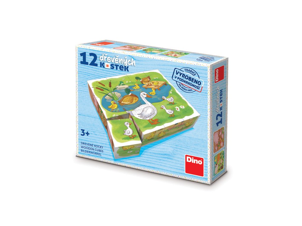 Dětské dřevěné kostičky, ze kterých lze sestavit 6 různých obrázků. Balení obsahuje 12 kostiček. Věk: 3+
