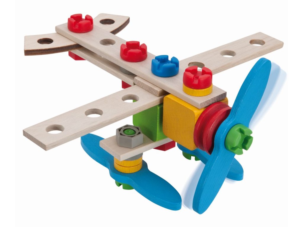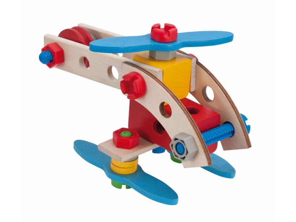 Dřevěná stavebnice, ze ktré lze sestavit 2 modely: letadlo nebo helikoptéru. Obsahuje 40 dílů. Plastové spojovací díly.