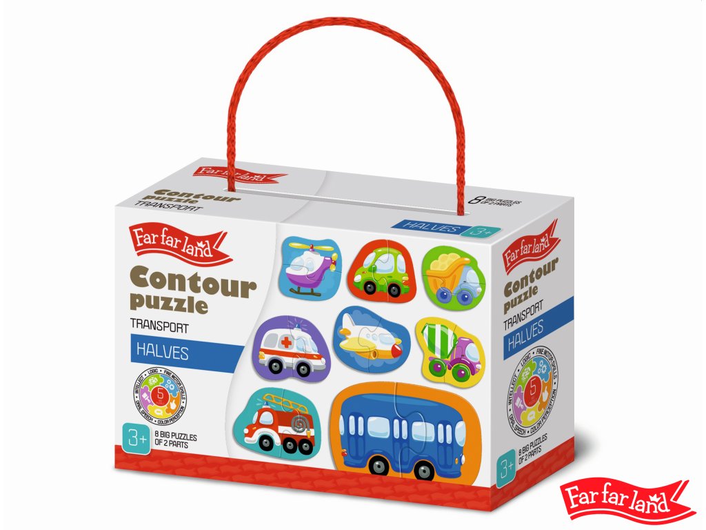 Puzzle obrysové pro děti, motiv dopravní prostředky. Balení obsahuje 8 obrázků, které se skládají ze 2 dílků.