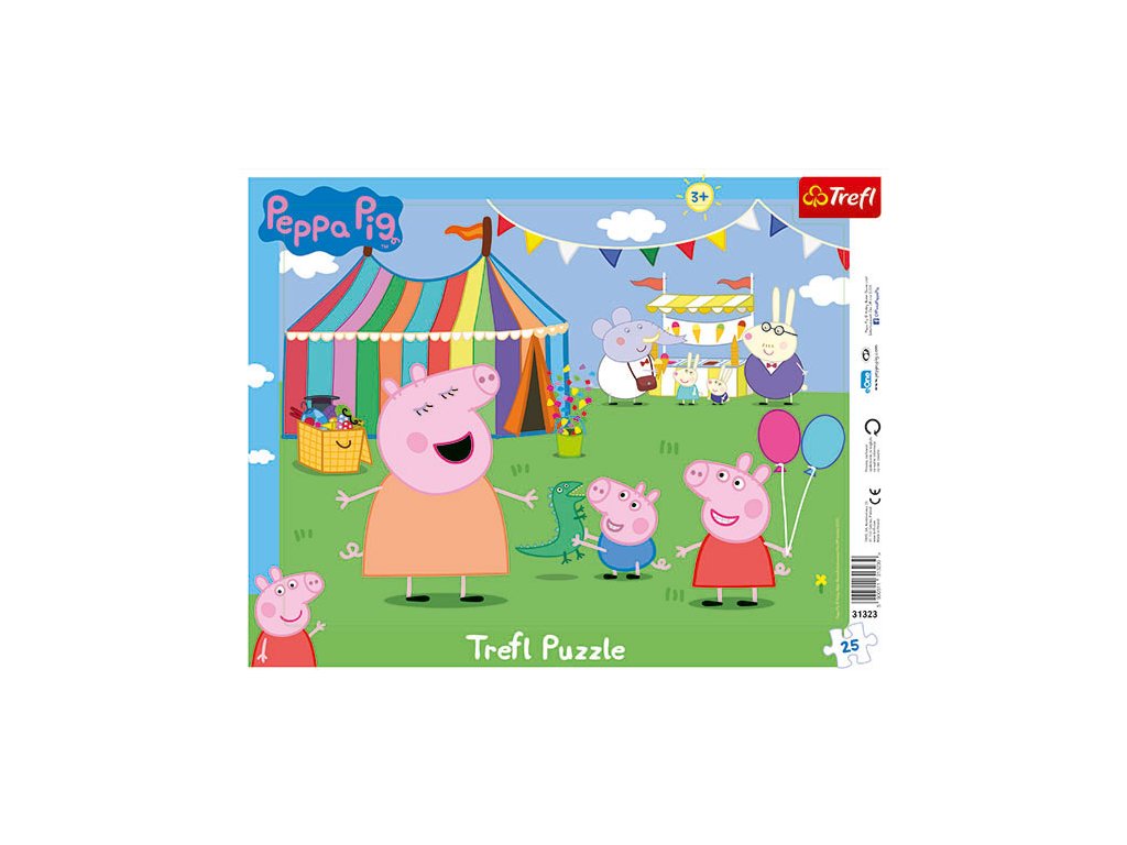 Trefl Puzzle vkládací 25 - Peppa Pig. Puzzle nemá standardní tvar dílků, jak je známe z klasického skládání. Obrázek je složen z částí nepravidelného tvaru bez zámků, jako by ho někdo rozpraskal.
