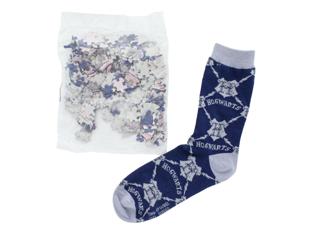 Oficiální produkt - puzzle v ponožce z katalogu zboží s logem, fotografiemi a grafikou kouzelnického filmové a knižní ságy Harry Potter.