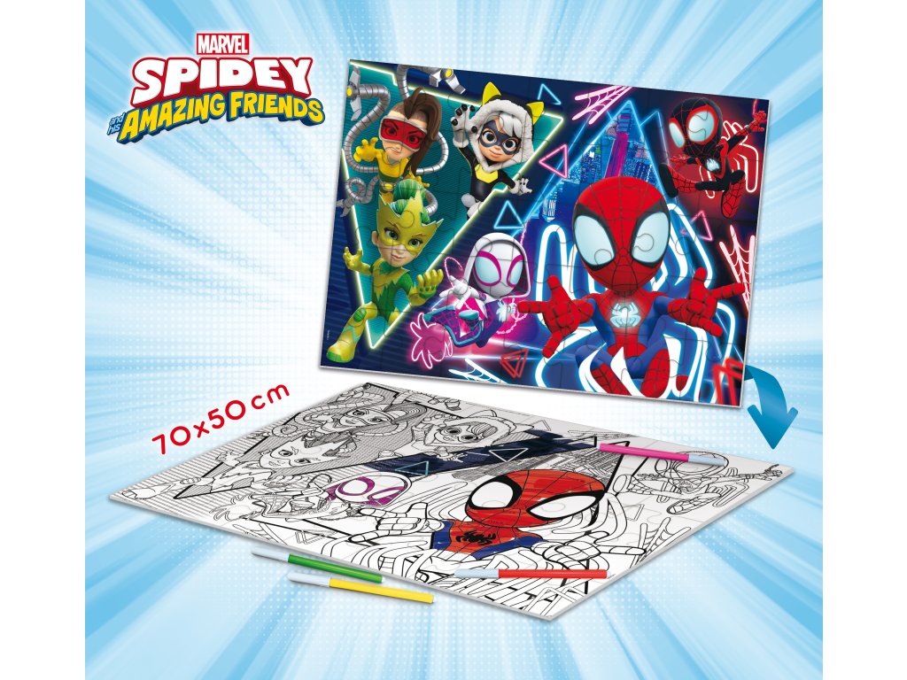 Spider-man Spidey Puzzle MAXI-FLOOR oboustranné. Rozměry složeného obrázku 70x50 cm. Balení obsahuje 35 dílků. Jedna strana je potisknutá barevně, druhá je určena k vymalování.