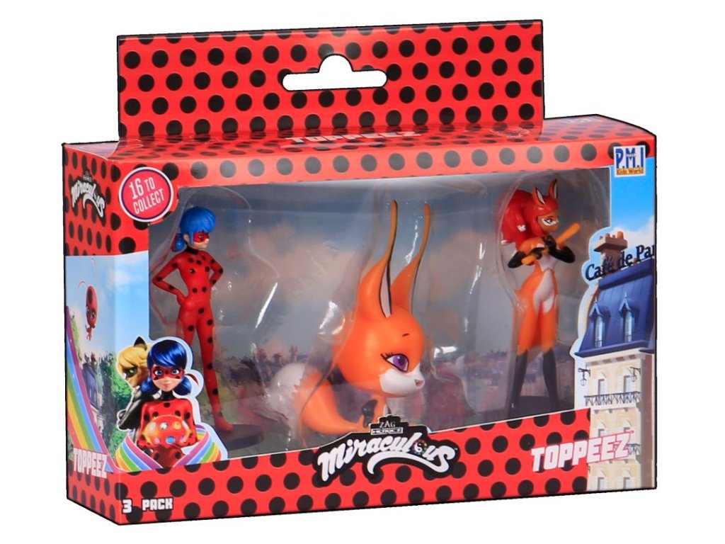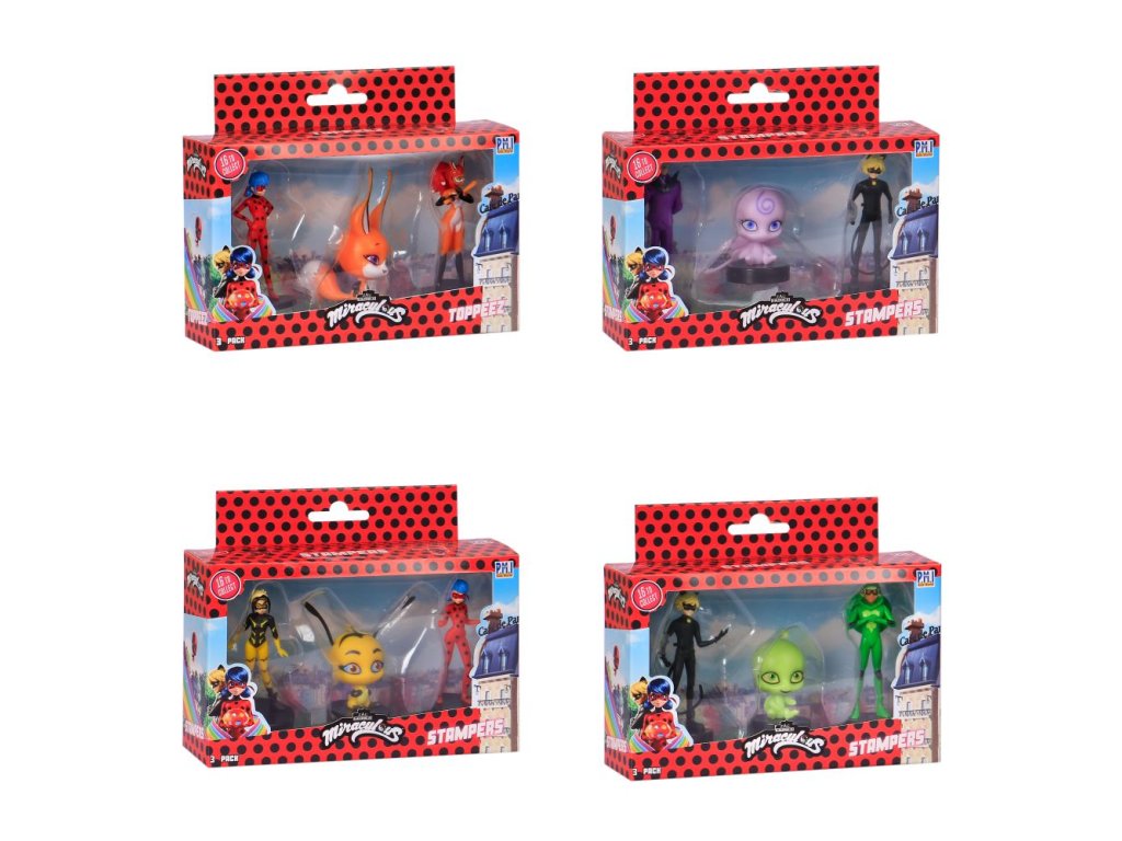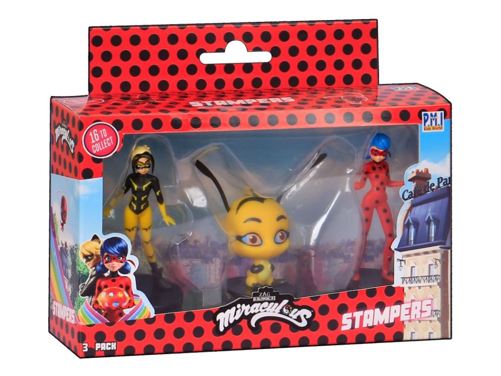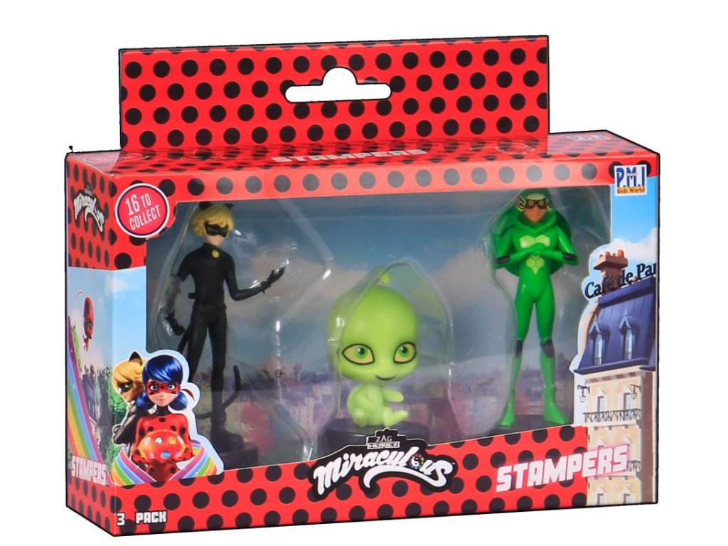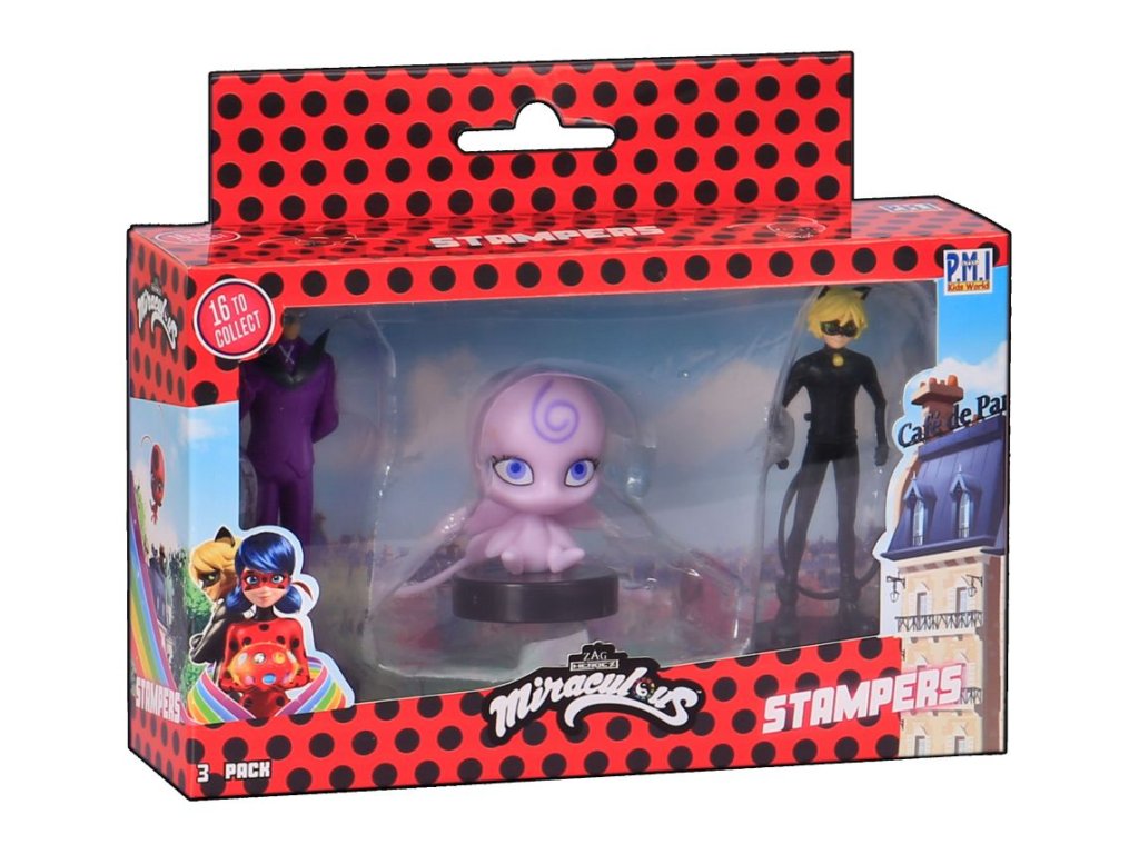 Tři kouzelné figurky z pohádky Miraculous: Beruška a černý kocour s razítky. Tyto figurky mají ve spodní části razítka, takže děti si mohou ozdobit školní práce, vytvořit nové obrázky a další. Vhodné pro děti od 3 let.