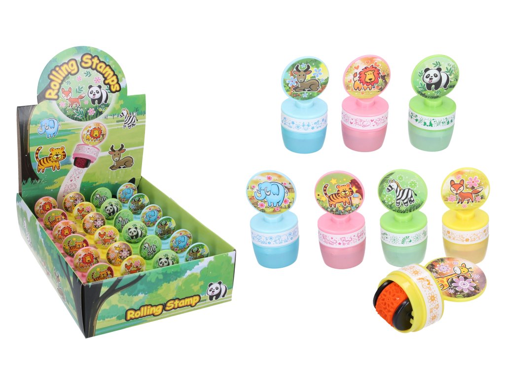 Razítko rolovací zvířátka. 24 ks v display boxu. 8 variant: žírafa, tygr, lev, liška, slon, kozoroh, panda a zebra.
