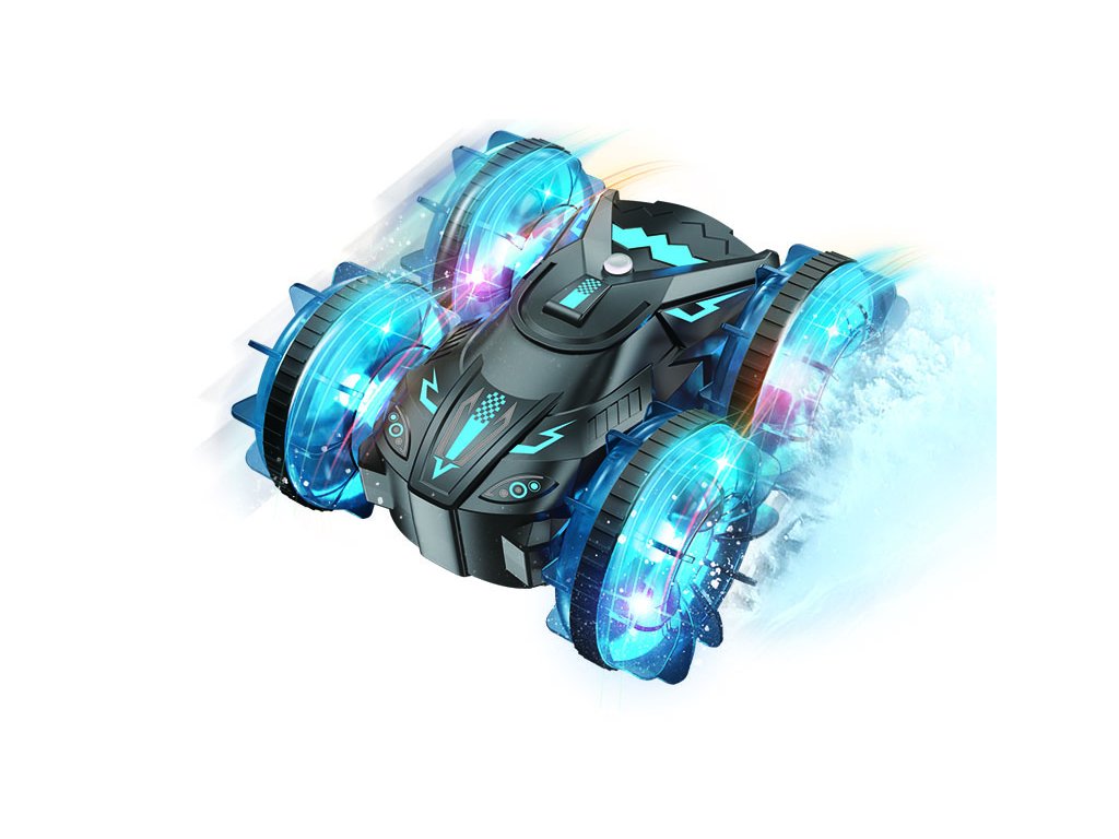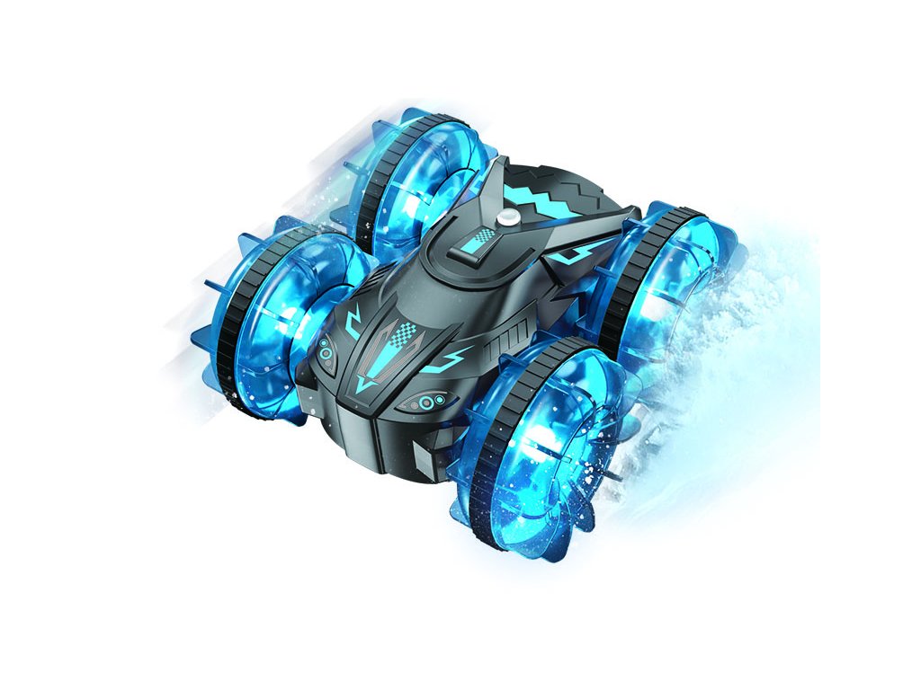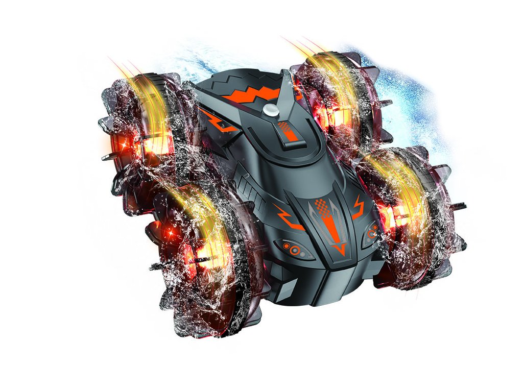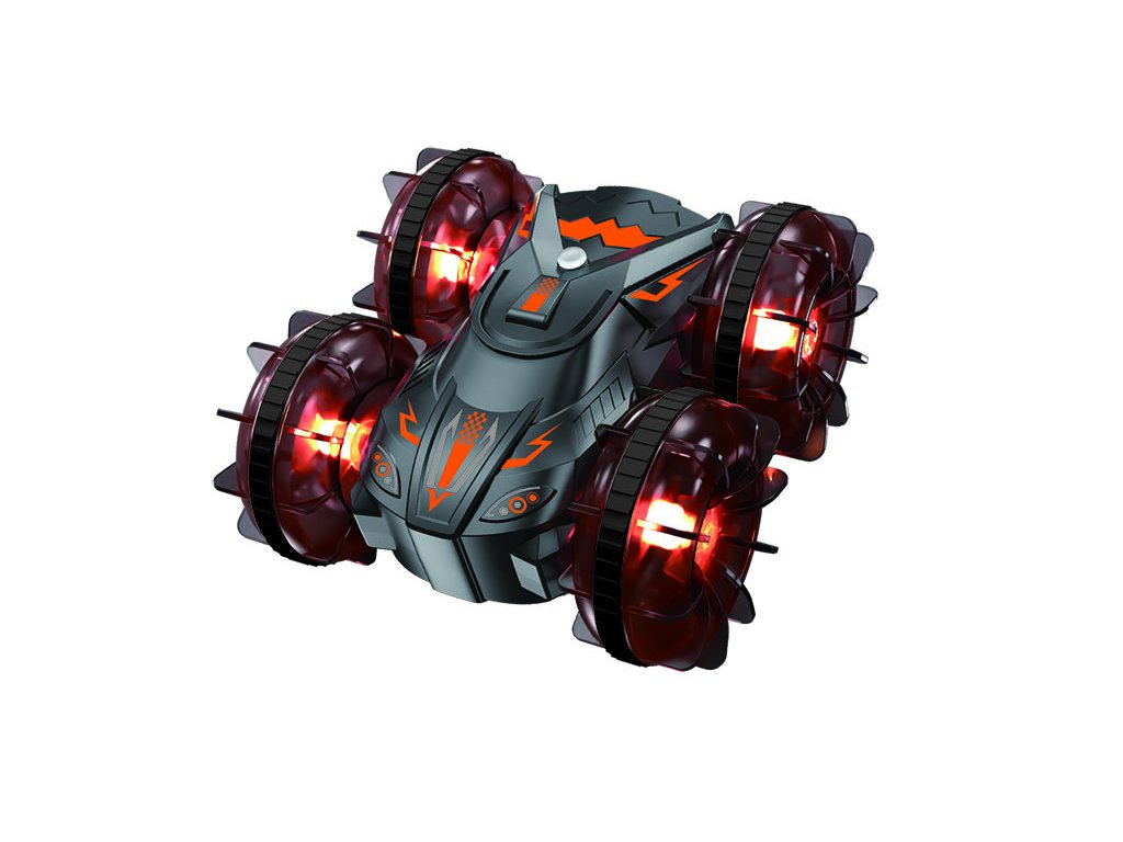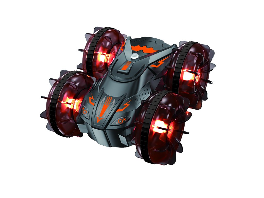 RC autíčko jezdí všemi směry. Jezdí i ve vodě. Při nárazu se otočí o odjede směrem, kterým přijelo. Při jízdě mu svítí kola. Dosah ovládača 40 m. Doba nabíjení 90 minut. Doba jízdy 25 minut.