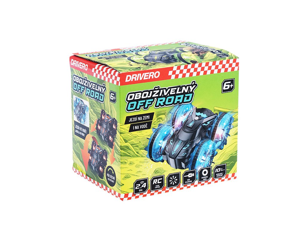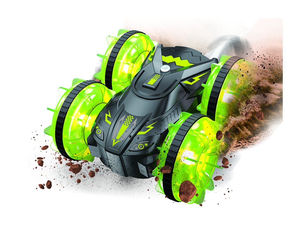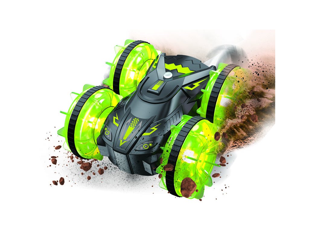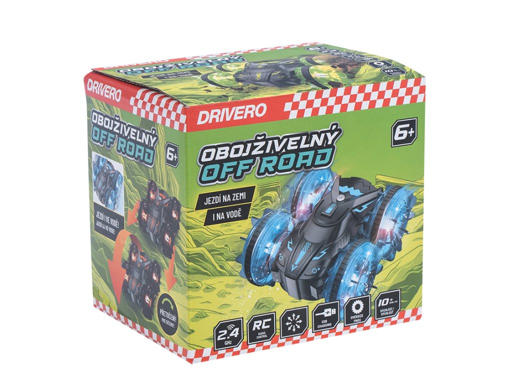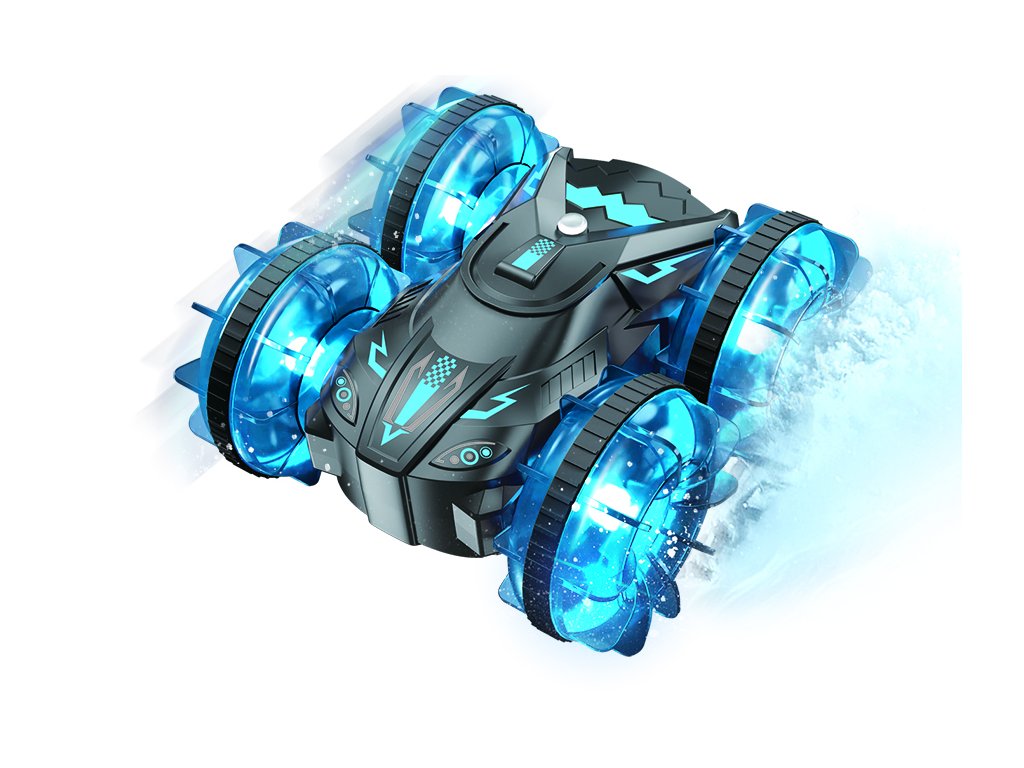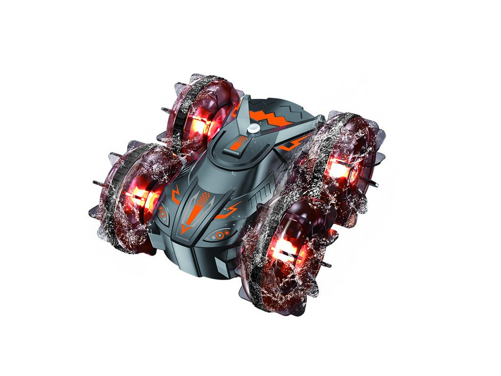 RC autíčko jezdí všemi směry. Jezdí i ve vodě. Při nárazu se otočí o odjede směrem, kterým přijelo. Při jízdě mu svítí kola. Dosah ovládača 40 m. Doba nabíjení 90 minut. Doba jízdy 25 minut.